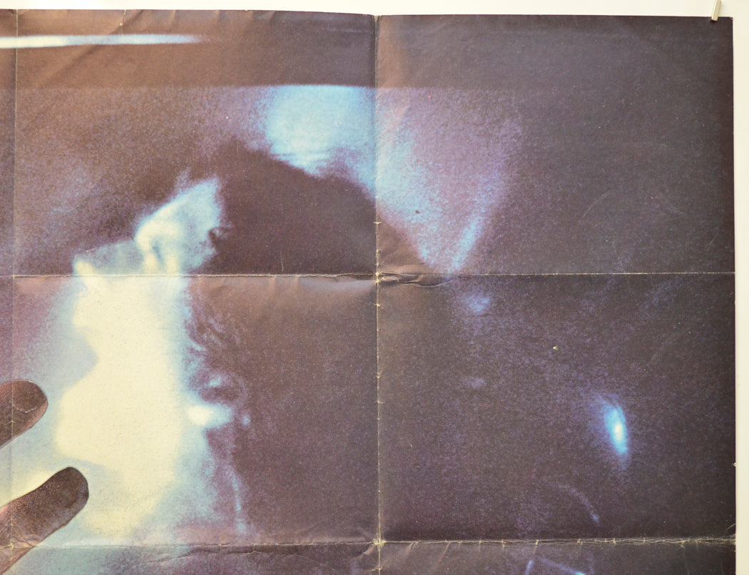 Originally printed on slightly smaller stock than a regular quad poster (this has not been cropped), 2 cm tear and a tiny tear on the top edge, tiny crease across the tips of the top corners, three tiny tears and extremely mild creasing on the right edge, 4 cm tear on the bottom edge (to the right of the right vertical fold line), 10 cm light diagonal crease and a 7 cm diagonal crease across the bottom left corner, 1 cm tear on the left edge, extremely tiny spot of print loss near the top left corner, some light surface creasing near the side edges including a 7 cm light diagonal crease near the right edge, light 7 cm vertical crease from the O in the title up towards the fingers, mild fold wear (stress marks on all fold lines and an extremely tiny wear hole at two of the fold intersections… Note there are three horizontal and three vertical folds), faint horizontal printed line at the base of the title lettering (this would have been a guideline where the the lettering on the original master was set), title has been written on the back in Biro and there are a couple of small faint brown spots of damp also on the back along with a tiny stain spot on the back of the top right corner area (all only noticeable on the front if the poster is held up to the light / backlit), otherwise very good.
