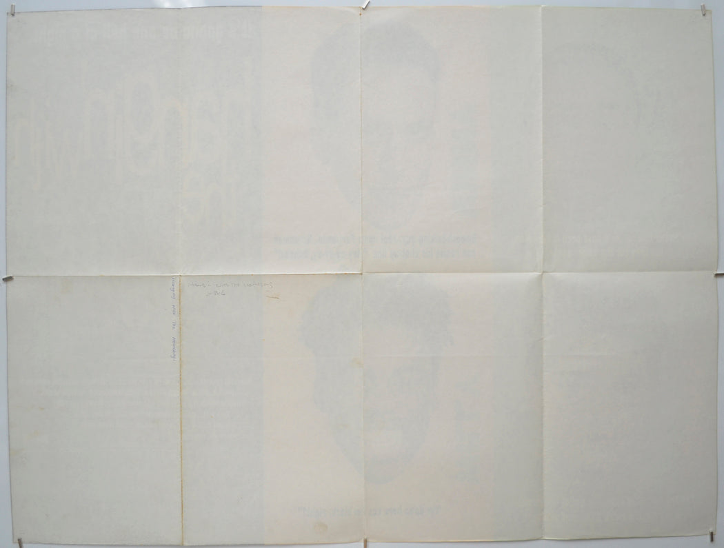 Extremely tiny tear at the bottom of the right vertical fold line, extremely tiny tear on the left edge, small patch of blu-tac grease/residue below the bottom left corner of the credits block and another in the yellow background to the left of it, additional small patch of blu-tac grease/residue just left of the chin of the man at the bottom center, 1 to 3 pinholes near every corner and the center of the top and bottom edges, very light creasing around the fold intersections, additional very faint horizontal fold line across the poster (going through the foreheads of the characters at the bottom), the title has been written on the back in blue Biro and there is Browning/Brown speckles of damp on the back of the bottom half of the right vertical fold line (only noticeable on the front if the poster is held up to the light / backlit), some very light fingermarks around the top right corner, there is some original Canon cinemas specific printed text at the bottom right which appears to have been overprinted with black print by the distributor, otherwise very good.