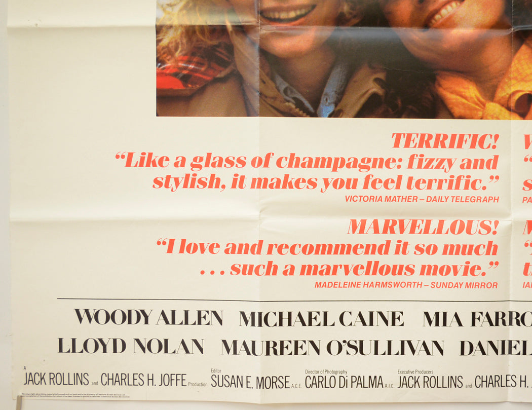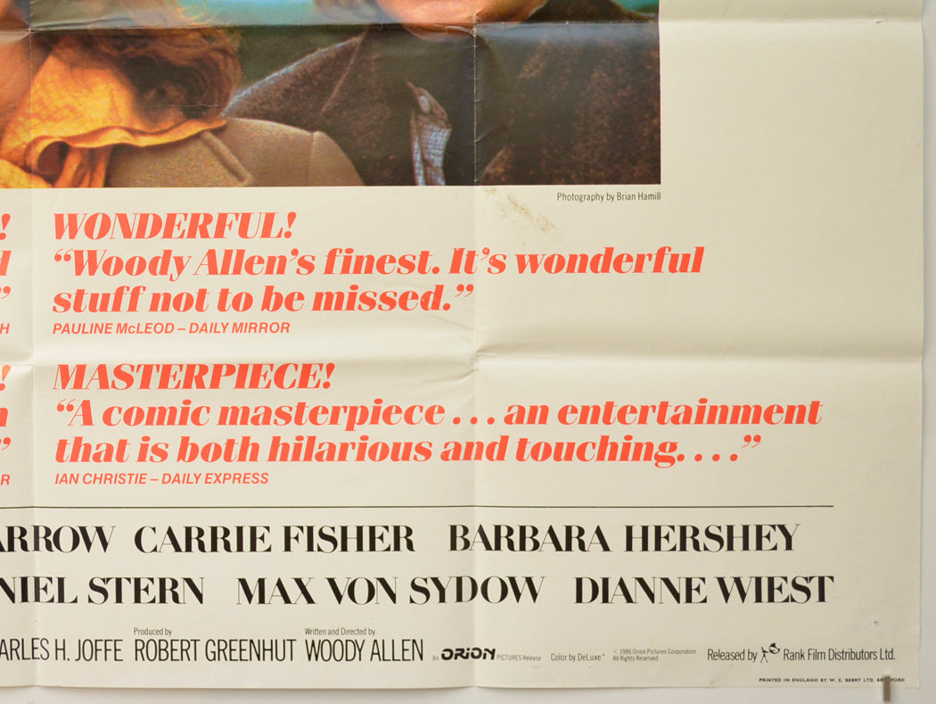 Woody Allen, Michael Caine, Mia Farrow, Carrie Fisher, Barbara Hershey, Lloyd Nolan, Maureen O'Sullivan, Max Von Sydow, Dianne Wiest, Julia Louis-Dreyfus, Julie Kavner, J. T. Walsh, John Turturro, Tony Roberts, Joanna Gleason, Sam Waterston, Daniel Stern, John Doumanian.