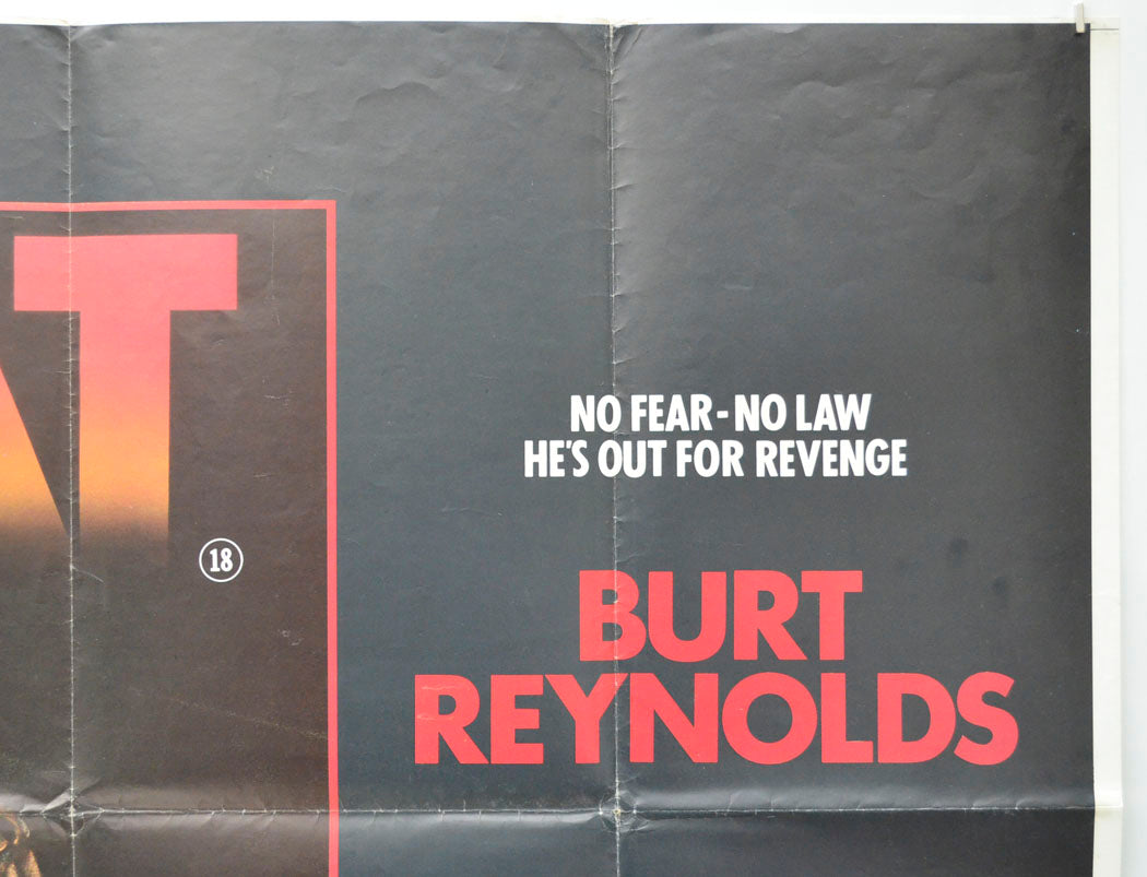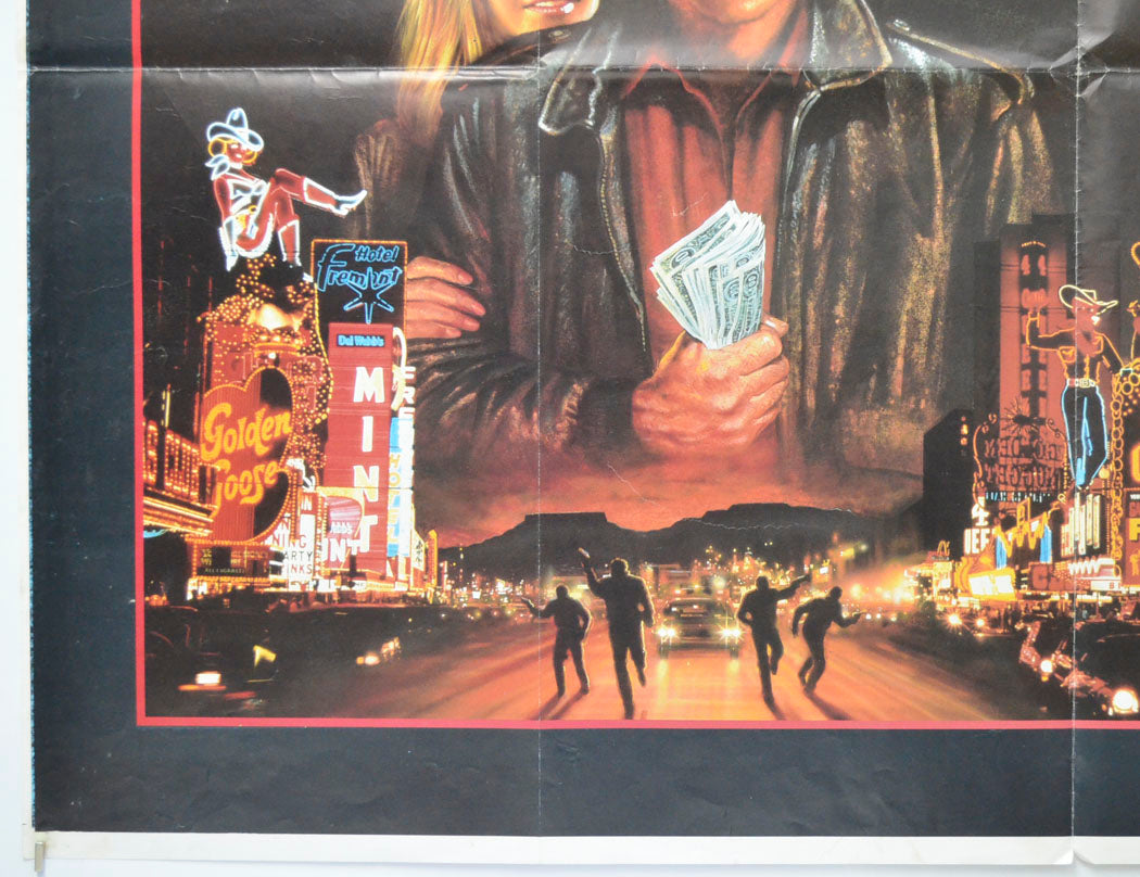 Probably a printers proof as it has not been cut down to size, approximately four extremely tiny tears and very mild creasing/edge wear on the top edge including some tiny faint Brown speckles of damp on the tip of the edge, tiny tear and a very small light Brown liquid spot at the bottom of the right vertical fold line, small tear at the center of the bottom edge, 5 x 2 cm faint Brown liquid stain in the bottom border (left of center), tiny faint speckles of damp on the tip of the left edge, blu-tac grease marks near every corner and the edge of every fold line (coming from blu-tac residue on the back of the corners), the surface is lightly creased/wrinkled throughout (heavier near the left edge), approximately 25 tiny faint water splashes within and around the first letter of the title, plus some additional water splashes near the left edge (all of these are only noticeable at certain viewing angles), some additional tiny water splashes above Reynolds head (again only noticeable at certain viewing angles), 4 cm horizontal crease through the bottom of the A in the title, 11 cm scuff/score line in black background above the casinos on the right, 4 cm surface crease just left of the second line of the credits block, light 12 cm surface crease below Reynolds’s hand, 4 cm and a 2 cm surface crease to the left of and above the money, mild fold wear including a tiny wear hole at the center and right fold intersections plus white stress marks on the fold lines, additional Browning/Brown’s speckles of damp along the back of the right half of the center horizontal fold line and the back of the right vertical fold line (only noticeable on the front if the poster is held up to the light / backlit), 6 x 1 cm faint Brown water stain on the back of the top of the right vertical fold line (only noticeable on the front if the poster is held up to the light / backlit), otherwise good.