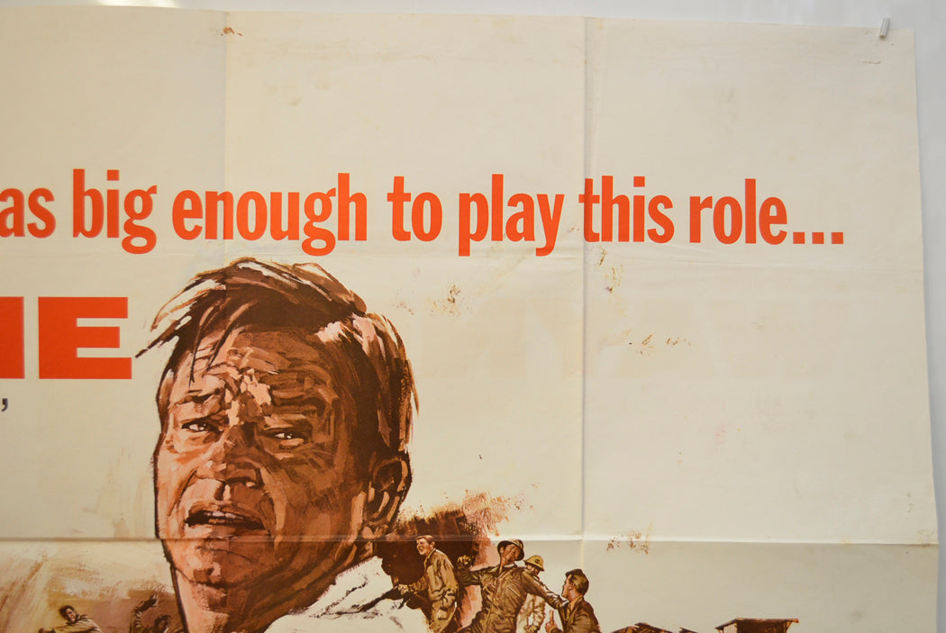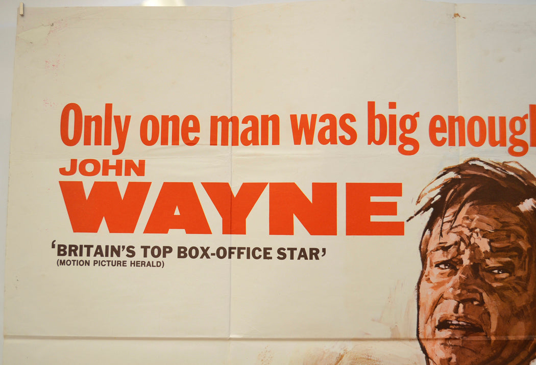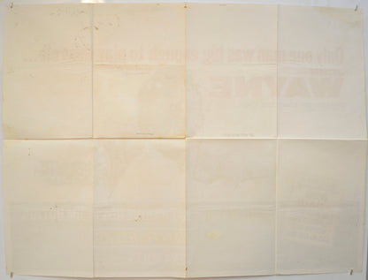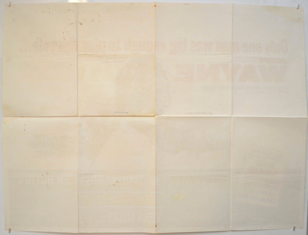 5 x 2 cm piece torn from just below the top left corner (has a 13 x 5 cm white repair patch on the back of it covering the hole), surface creasing across the top left corner area, 32 cm horizontal crease from just below the top of the left edge across to the top of the left vertical fold line, some greyish splash stains on the tip of the left edge and near the bottom of the left white border, a couple of small dark Brown stain spots just below the top center, some grubby fingermarks around the top center area and also near every corner and just below the center of the right edge, reddish print has transferred into the top left corner area, 1 cm pinhole tear in the Brown background just below the John Wayne credit (there is small white repair patch on the back of this), extremely mild edge wear, 3 to 5 pinholes near every corner and the center of every edge (some have torn slightly), 7 x 4 cm white repair patch on the back of the center of the right edge (covering some small pinhole tears), duplicate fold lines where it has been folded slightly out of alignment, extremely mild fold wear (note there are three horizontal fold lines), some of the red print from the John Wayne credit has created a faint reverse impression in the white background on the right of the poster (due to the two sides touching whilst stored folded many years), numerous light grey liquid splashes on the back of the poster (mostly around the right corner area…only noticeable on the front if the poster is held up to the light / backlit), otherwise good.