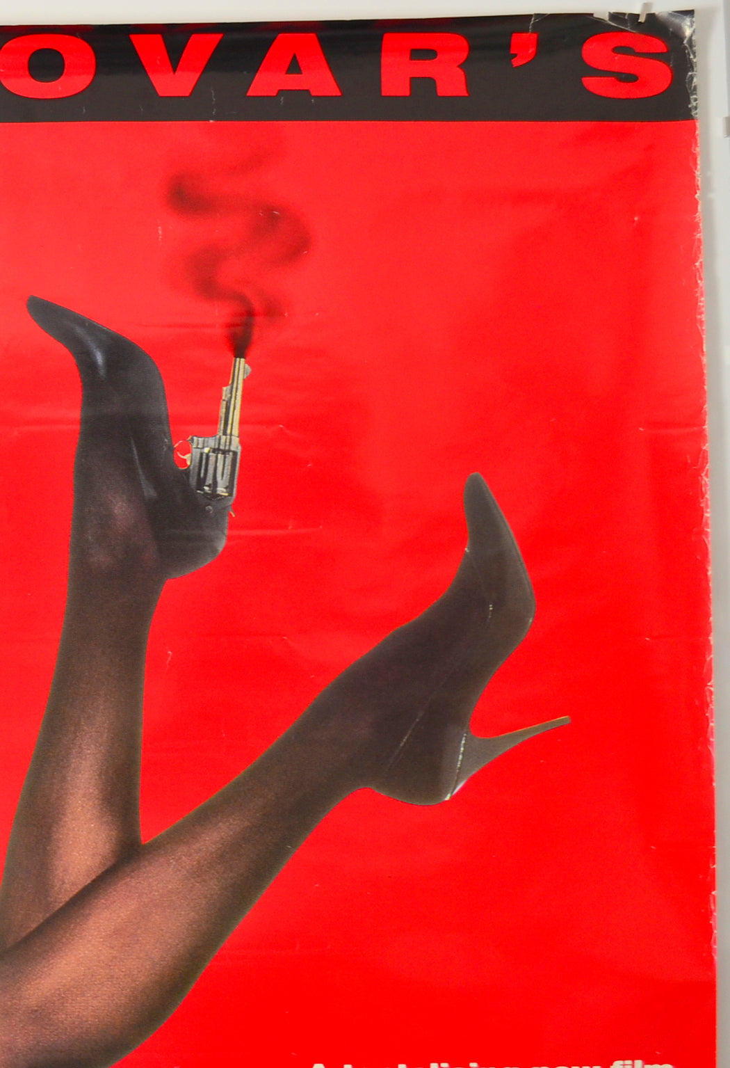 1 cm piece torn from the top edge (near right corner), 3 cm tear and a 2 cm tear also on the top edge (both have tape on the back), a couple of tiny tears and moderate creasing also on the top edge, eight small tears and heavy creasing to the top half of the right edge along with a little edge wear, mild creasing around the bottom of the left edge, tiny tear and mild creasing on the bottom edge, numerous light horizontal creases completely across the poster (more noticeable in the black background), band of approximately 25 small white surface creases from top to bottom (around the right edge of the black background area), some additional white surface creases through and around the Almodovar credit at the top, a few random white surface creases above the gun, 20 cm white surface crease in the black background near the bottom center, otherwise okay.