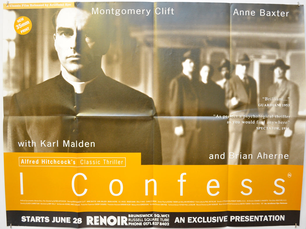 “I Confess” (Poster for the 1995 Artificial Eye re-release of the 1953 Hitchock Classic) Original Quad Poster - Film Poster - Movie Poster