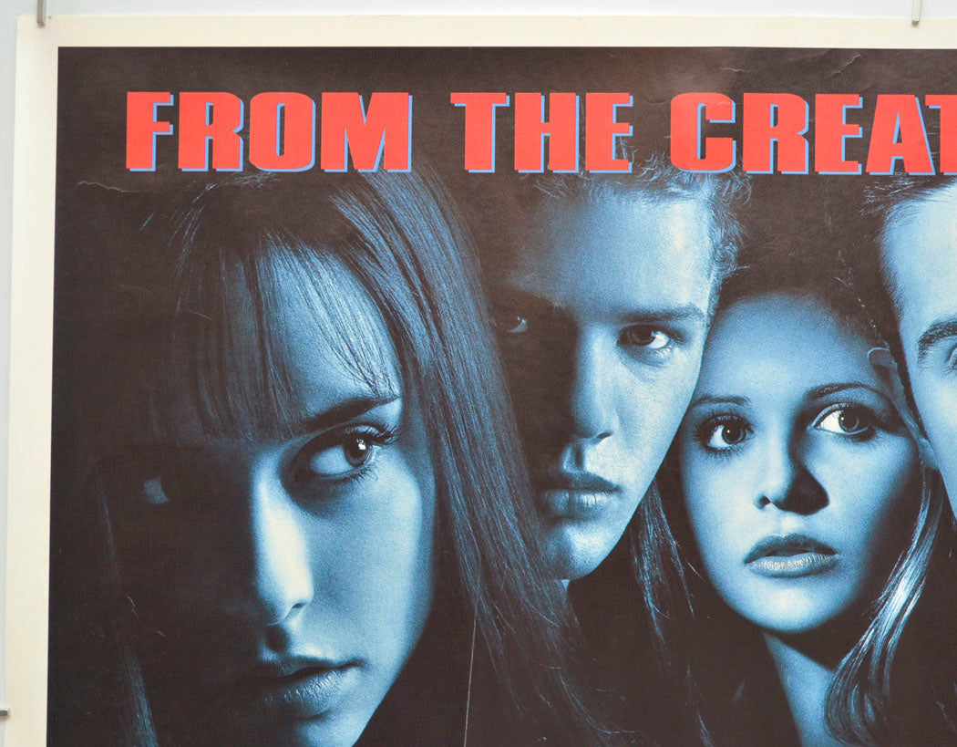 Three vertical (ish) white fold/crease lines from top to bottom (one through the right of Jennifer Love-Hewitt, another one down through the center of the poster and the other down through the last few letters of the title), 10 cm horizontal white crease with some surrounding creases near the center of the poster, numerous small white surface creases within the black background near the right edge and a few near the left edge, 8 cm horizontal white surface crease through Love-Hewitt’s arm, a couple of smaller surface creases just below the hook, a few random small white surface creases, small crease across the left corners, a couple of tiny tears and moderate creasing on the right edge, some dark print has transferred into the outer border (particularly the right), a couple of small patches of Brown damp spots in the top border, a little blu-tac grease on the back of each corner ,otherwise okay but the creasing is noticeable due to the black background.