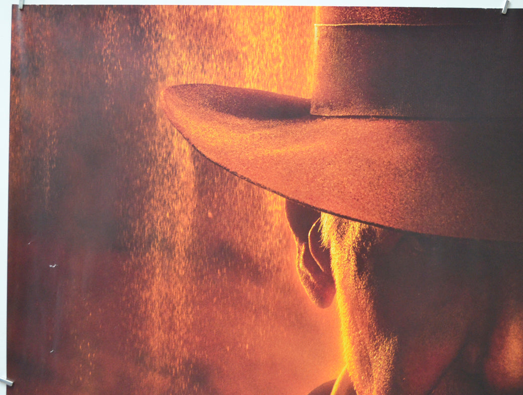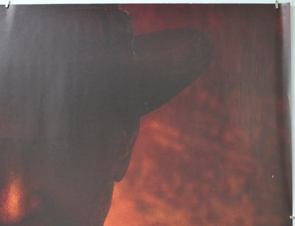 Two tiny tears and very mild edge wear on the top edge, 1 cm tear near the bottom of the right edge, 1 cm tear and a couple of tiny tears on the bottom edge along with mild creasing/edge wear, 3 cm diagonal white crease line and a small tear at the bottom of the left edge, six slightly diagonal 11 cm creases evenly spaced across the bottom of the poster (from the bottom edge upwards) all of these have several white stress marks on them, approximately 14 small white surface creases also evenly spaced across the poster (just below the IN CINEMAS SOON level), several small white surface creases near the left edge and a couple near the right edge, approximately six small dull greyish marks within the right edge and rim of the hat, a little reddish print has transferred into the yellow of the IN CINEMAS SOON text, pinhole near the bottom of the left edge, a little blu-tac residue near the corners, otherwise okay.