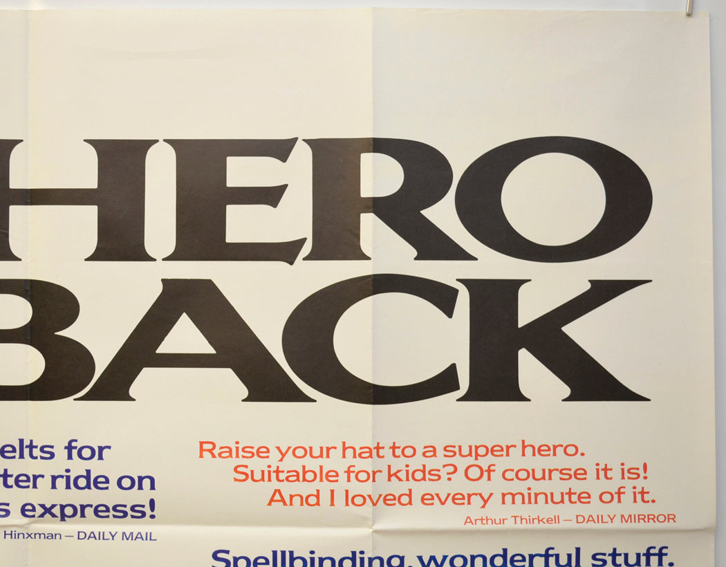 Extremely mild creasing on the top edge (right), 7 cm light diagonal crease across the bottom right corner, a couple of extremely tiny tears and mild creasing on the bottom edge, extremely tiny Brown stain spot on the tip of the bottom edge (left of center), tiny crease across the tip of the bottom left corner, light creasing around some of the fold intersections (note there are three horizontal and three vertical folds), two 9 cm horizontal creases just below the top edge (above the H in the HERO text), title written on the back in Biro in very small letters (only noticeable on the front if the poster is held up to the light / backlit), otherwise excellent!