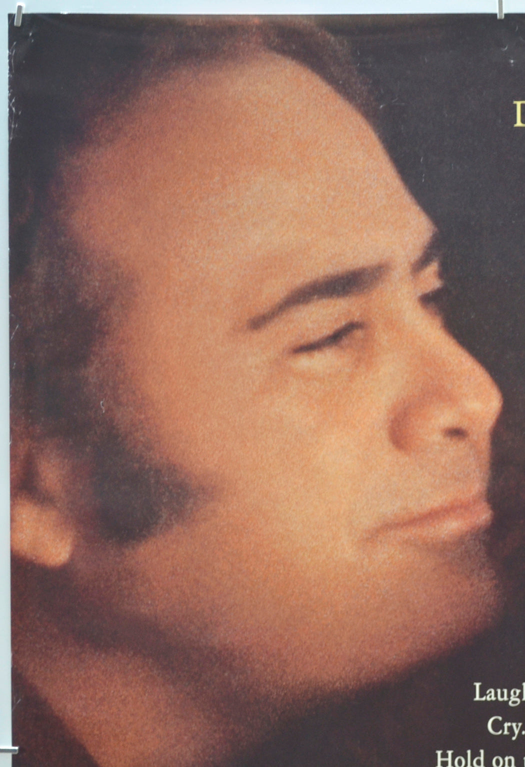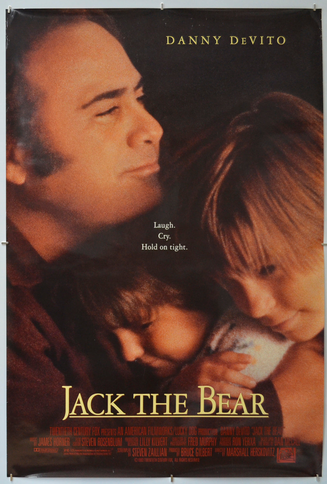 Tiny crease across the tip of the top left corner, tiny dent on the top edge (left), numerous tiny white surface creases within the top 5 inches (12 cm) of the poster (mostly above the Danny credit), mild creasing on the side edges (heavier near the top), several small white surface creases near the bottom edge, 2 cm vertical white surface crease and a smaller crease just below the nose of the child at the center, otherwise good.