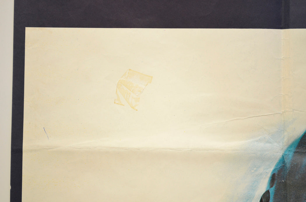 3 x 3 cm and a patch of tape adhesive staining with a little surface print loss within it near the top left corner of the white background, 1.5 cm fine blue line in the white background near the top of the left edge, approximately 4 small brownish spots of damp near the bottom of the left edge of the white background, approximately 4 extremely tiny tears and very mild creasing/edge wear on the top edge, 2 cm tear and a couple of tiny creases on the right edge, tiny tear on the bottom edge, extremely mild creasing/edge wear on the left edge, light 7 cm diagonal crease across the bottom left corner, creasing around the top of the center vertical fold line, additional creasing around all three vertical folds and the three horizontal folds due to being folded out of alignment and refolded (some of the creases go off at a slight diagonal), the top and bottom horizontal folds are not particularly straight, tiny white spot of print loss within the MUSIC BY credit near the bottom right corner, the MAY BE TOO INTENSE FOR YOUNGER CHILDREN text at the bottom right has been overprinted with a block of dark blue print (I believe this was done at the printers before distribution to the cinemas as it has been on every copy of this poster I have seen), some blue and red print has transferred onto some light surface creasing in the white background near the left edge and also along the left of the horizontal fold lines, mild fold wear including a couple of tiny separations on the left vertical fold line plus creasing around the fold intersections, tape adhesive staining on the back of every corner some with a tiny amount of surface paper loss (these very faintly visible on the front… More noticeable if held to light/backlit), couple small spots of tape adhesive staining on the back of the left and right fold intersections on the center horizontal fold line (not noticeable on front unless backlit), otherwise very good.