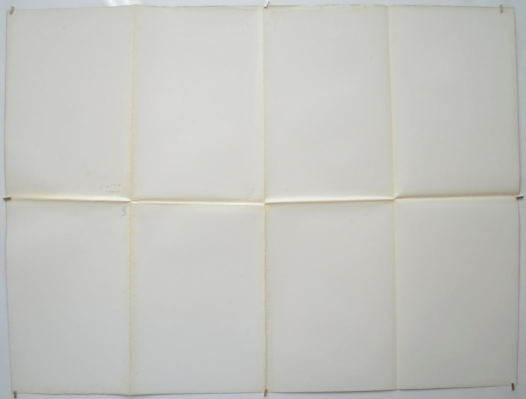 Two extremely tiny tears on the top edge, tiny crease across the tip of the top right corner, extremely tiny tear and extremely mild creasing on the bottom edge (right), tiny crease near the top of the left edge, extremely mild fold wear (some stress marks on some of the fold lines and additional creasing around the right vertical fold line), tiny white crease just below the top center, the back of the fold lines have yellowed slightly/ have faint speckles of damp on and around them and the title has been written on the back in blue Biro (all only noticeable on the front if the poster is held up to the light / backlit), otherwise very good.