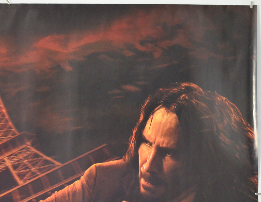 Numerous small white surface creases within the first 6 inches (15 cm) of the left of the poster (mostly to the left of the title including one within the W), a couple of tiny creases on the top edge, extremely mild creasing and a tiny tear on the bottom edge, small blu-tac grease mark and a couple of tiny specks of print loss just below the 4 near the bottom right corner and another within the bottom left of Reeves’s jacket, slight wrinkle to the tips of the top and bottom edges and a faint indentation line near the edges indicating the poster was probably displayed in a cinema snap frame, 2 cm diagonal crease across the top right corner, otherwise good.