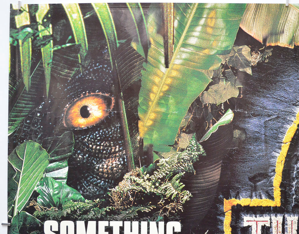 6 cm jagged tear on the right edge (has tape on the back), a couple small creases also on the right edge, tiny tear and extremely mild creasing on the top edge, a couple of tiny tears and mild/moderate creasing along the bottom edge, the poster has very slightly yellowed (the white SOMETHING HAS SURVIVED text is a little off white), the surface is fairly wrinkled/creased throughout (only really noticeable at certain viewing angles), otherwise good.