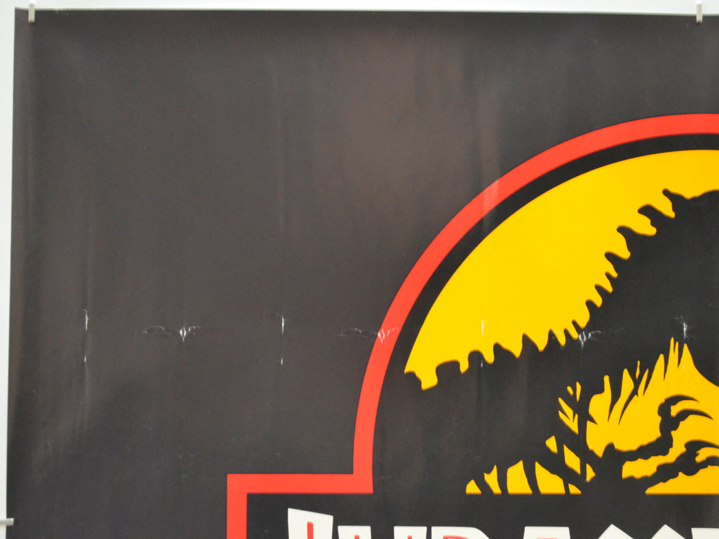 Approximately 14 light vertical creases from top to bottom evenly spaced across the posters (a little heavier on the left), horizontal band of approximately 16 thick white crease marks evenly spaced across the poster (intersecting the previously mentioned vertical folds… going through the dinosaurs jaw level) these were probably caused by a dent in the poster whilst stored rolled, additional horizontal band of approximately 14 smaller lighter white creases evenly spaced across the poster (just below the title text) with some additional creasing below, additional lighter creasing across the poster just above the SUMMER 1993 text at the bottom, a few additional tiny white surface creases between the side edges and the edges of the title area, 3 cm diagonal crease across the top right corner, a couple of tiny creases on the right edge, three tiny tears and mild creasing on the bottom edge (mostly near the corners), otherwise good (In my opinion it would still look impressive if framed).
