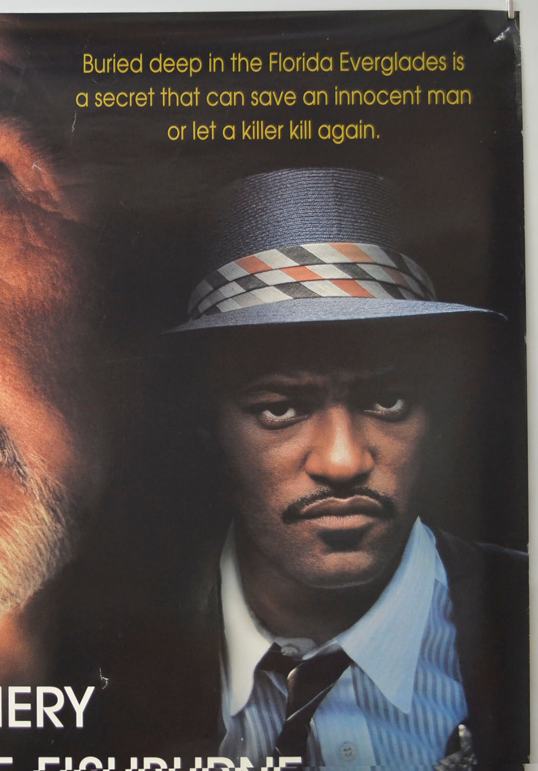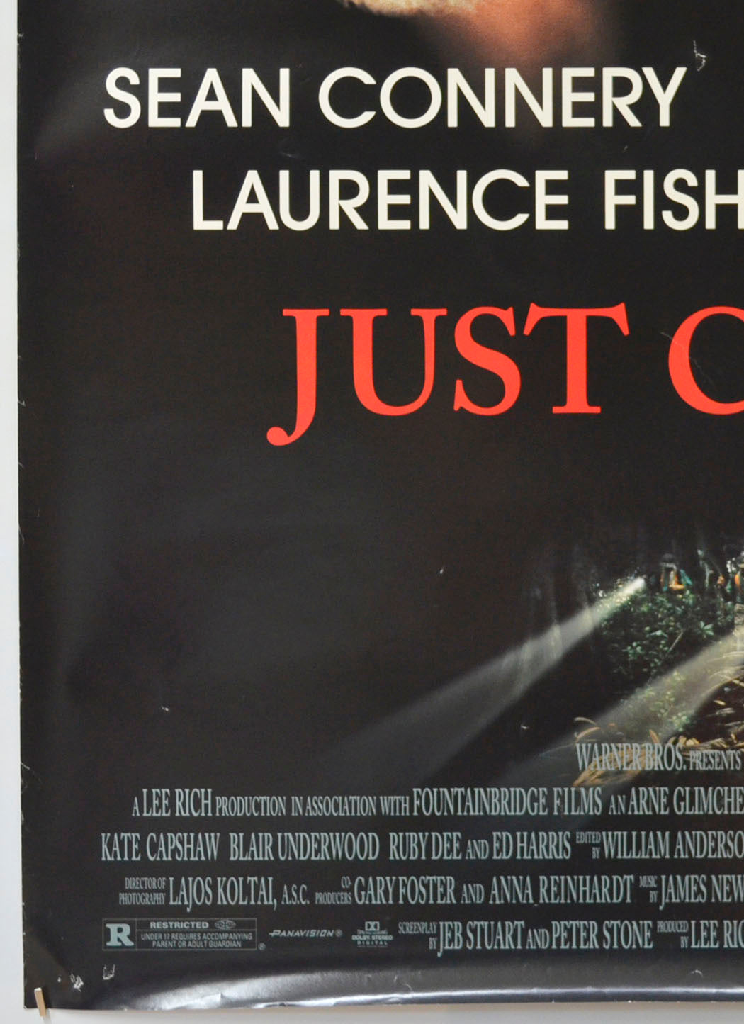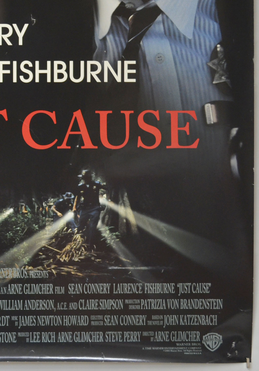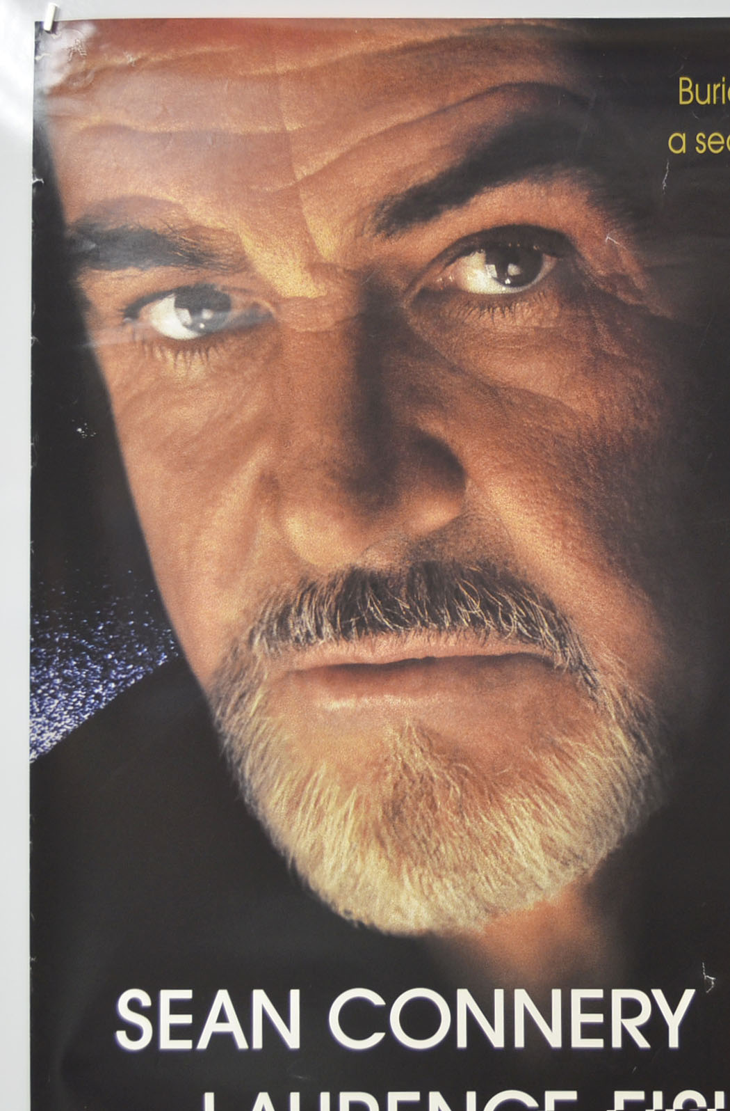 2 to 5 pinholes near every corner and most have torn into larger holes, three small white patches of print loss near the top left corner, approximately three tiny tears and mild creasing on the right edge, 2 cm crease along with some smaller creases on the bottom edge, 7 cm diagonal crease across the bottom right corner, 1 cm tear along with a couple of tiny tears and mild creasing on the left edge, some small speckles of patchy print loss in the black background to the left of Connery’s cheek, two small white surface creases just right of Connery’s right eye, 2 cm jagged surface tear just right of the Y in Connery, two small white surface creases above the N in Fishburne, three small white surface creases in the black background above the left of the credits block and a couple above the right of the credits block, 5 cm diagonal surface crease through the C in CAUSE, some additional light surface creasing here and there, a couple of fine scuff marks between Fishburne’s forehead and Connery’s cheek, otherwise okay.
