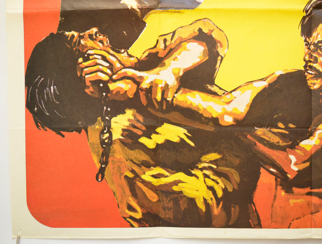 Tiny tear and very mild creasing on the top edge, slight Browning and a few tiny Brown spots of damp also on the top edge (mostly on the right), very mild creasing on the right edge, several small Brown spots of damp in the bottom white border, two pinholes near every corner (some have torn slightly), pinhole above the head of the man at the top, pinhole either side of the right vertical fold line (in the red background above the top horizontal fold line), very mild fold wear (note there are three horizontal fold lines), 4 x 2 cm light Brown liquid stain and a tiny Brown stain spot on the back of the right vertical fold line (this is lightly visible on the front in the red background near the top of the right vertical fold), additional tiny Brown stain spot in the red background near the top (left of the right vertical fold line) and another tiny Brown stain spot near the top of the left vertical fold line (above the shoulder), title written three times on the back in Biro (only noticeable on the front if the poster is held up to the light / backlit), otherwise very good.