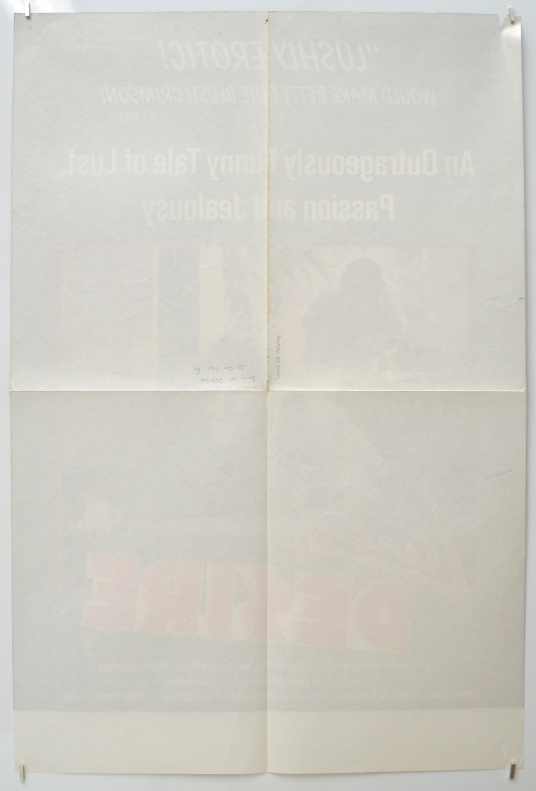 2 cm V shaped piece torn from the top edge, 2 cm tear and a tiny tear on the left edge along with light creasing near the bottom, two pinholes near every corner and the center of the top edge (some have torn slightly and the pinholes near the bottom left corner have torn together 2 cm with the paper scrunching up between them), pinhole within the top of the bottom white border (right of center), some light surface creasing near the left edge and top corners, very light 18 cm slightly diagonal crease going from the woman’s left knee down to just left of the D in DESIRE, the title has been written on the back in black Biro and there are a few tiny faint Brown specks of damp (foxing) on the back of the top half of the center vertical fold line (only noticeable on the front if the poster is held up to the light / backlit), otherwise very good.