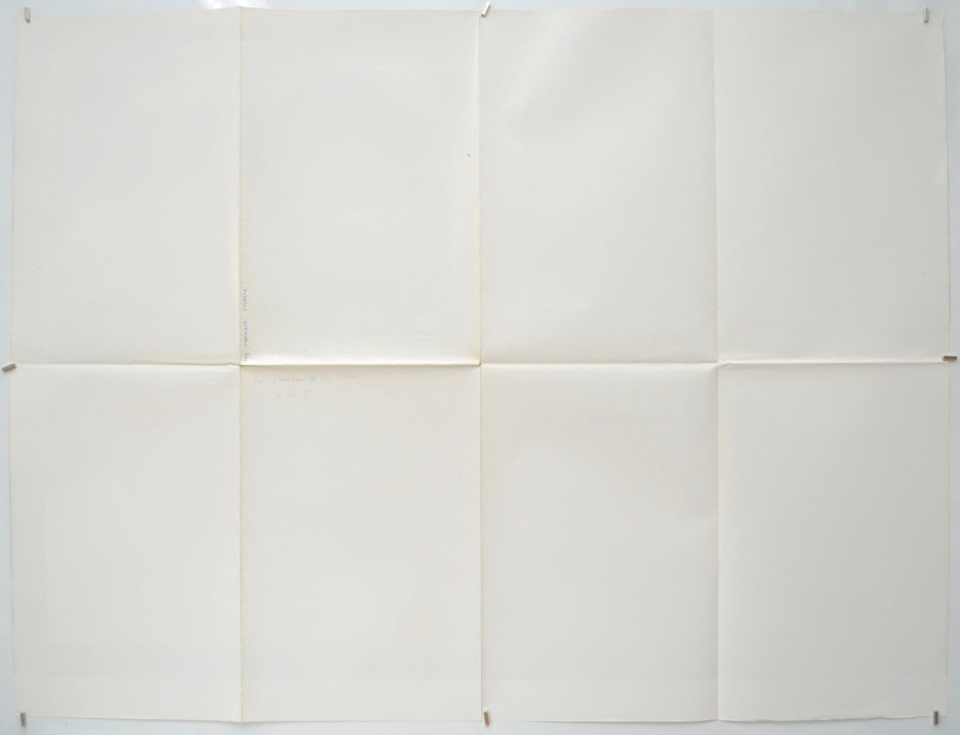 Extremely tiny tear and extremely mild creasing on the bottom edge, extremely mild edge wear at the top of the left edge, two pinholes within the top half of the right border, two pinholes near the top half of the left edge, very mild fold wear including a tiny separation at the center and right fold intersections along some light creasing around the intersections, the title has been written on the back in blue Biro (only noticeable on the front if the poster is held up to the light / backlit), otherwise very good.