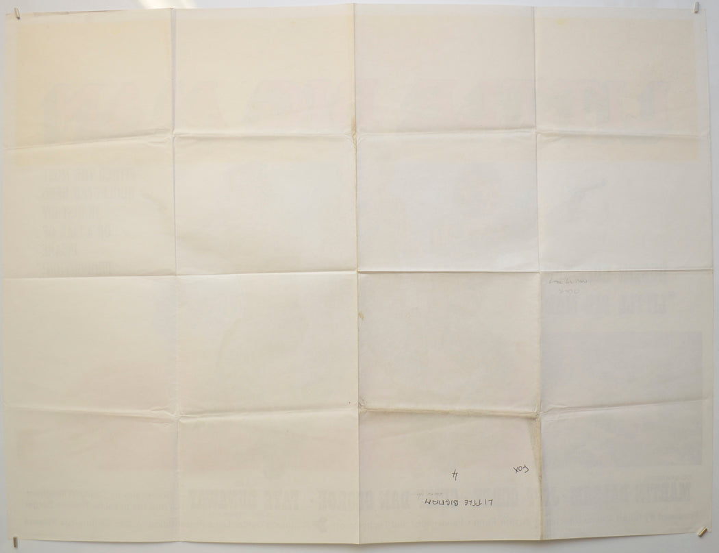 Four 1 cm tears and extremely mild creasing on the top edge, a couple of tiny lines of yellowish print on the tip of the left edge (near top), light creasing around the fold lines due to being folded slightly out of alignment and refolded, two tiny reddish spots of residue just above the M in the title, tiny faint Brown stain spot in the yellow background to the right of the top center, small grubby mark below the CINEMA text near the bottom center, extremely mild fold wear (creasing around the fold intersections), the title and a couple of small words have been written on the back in black felt pen (this is lightly visible on the front within and above the JEFF COREY credit at the bottom left… More noticeable if the poster is held to light/backlit), otherwise very good!