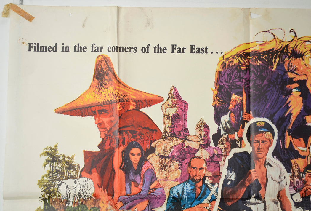 2 x 1 cm piece torn from the bottom left corner, piece of tape on all three remaining corners (longest is 6 cm and the adhesive has stained the paper beneath and the surrounding paper), approximately 12 Brown stain spots/patches of damp on the back of the bottom fold segment which is right of center (largest stain is approximately 3 x 2 cm) several of these are visible on the front in the white background around the characters above the “Peter O’Toole” credit and also around the bottom center and just right of O’Toole’s left knee… The rest are visible if the poster is held to light/backlit, faint patches of tape adhesive Browning around the top center (due to the surfaces touching whilst stored folded many years), 15 x 6 cm area of greyish patches around the top of the left vertical fold line (possibly damp spots?), 5 cm jagged tear at the top center, a couple of tiny tears and mild creasing also on the top edge, a few Brown spots of damp just below the top edge, 3 x 2 cm area of patchy tape adhesive spots just left of the “filmed” text at the top left and a couple of spots above the “high adventure” text at the top right, 2 cm tear and a couple of tiny tears on the bottom edge along with moderate creasing, a few Brown spots of damp along the bottom, approximately 5 tiny tears and mild creasing on the right edge along with several Brown spots of damp along the tip of the edge, crease across the top left and bottom right corners, 1 cm pinhole tear near the top edge (left) … There maybe a tiny spot of paper loss within it, pinhole near both top corners, fold wear including a small tear across the right vertical fold line plus additional creasing around the fold lines due to being folded out of alignment and refolded, surface is lightly creased/wrinkled throughout, whole poster has browned slightly, title written on the back in biro (only noticeable on the front if the poster is held up to the light / backlit), a couple of grubby marks near the right edge, main artwork is very good but overall the poster looks a bit grubby.