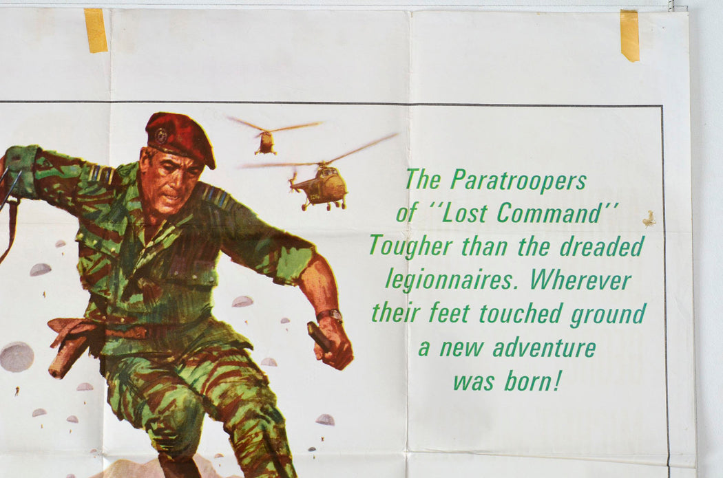Three 4x2cm pieces of sellotape on the top edge (there is a faint reverse impression around the top center of the two strips of tape nearer the sides due to the pieces touching the paper whilst being stored folded for many years, Mild edge wear on the top edge including a couple of tiny tears, Grubby mark around the top left corner, light brown mark in the left border just above center, 14cm edge tear from the bottom edge center up though the first “M” in the title, 1cm edge tear at the bottom of the left vertical fold line, Grubby grey streaks completely across the credits at the bottom (possibly from a frame), tape has been removed from the bottom edge (near the corners and center) this has taken a little of the print layer away from the credits in those areas, grubby green mark near the right edge (just right of “Command” in the tag lines, 2-3 pinholes near each corner, 4 pinholes near the top black border line and four along the bottom, light liquid stain just above the helicopter on the left, mild fold wear including a tiny wear hole on the fold intersections on the center and right vertical fold lines, title and a number written on the back of the poster in blue biro (only noticeable on the front if the poster is held up to the light / backlit), Otherwise Good.
