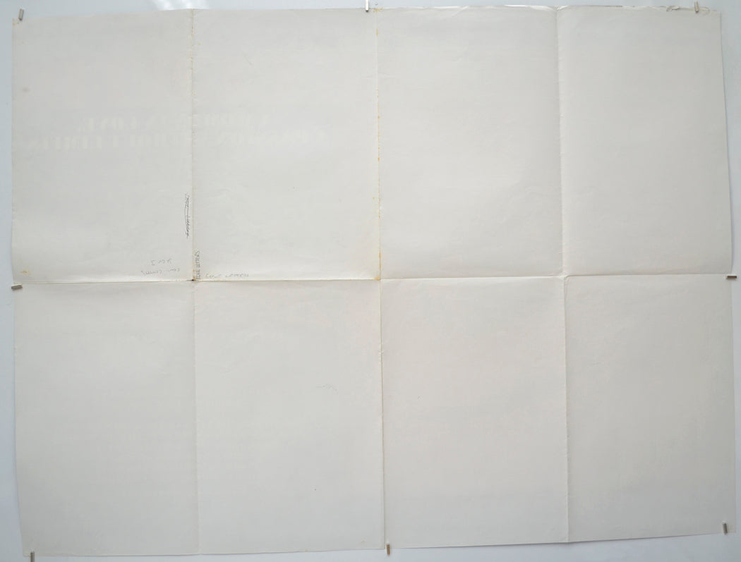 2 x 1 cm piece torn from the top left corner, 1 cm diagonal tear and creasing through the remainder of the top left corner, 2 cm jagged tear with surrounding creasing and edge wear along with a couple of tiny tears also on the left of the top edge, extremely tiny piece worn away from the tip of the center of the top edge with some surrounding edge wear, two tiny tears on the right edge, 1 cm diagonal crease across the bottom right corner, very mild edge wear on the bottom edge, 2 to 3 pinholes near every corner and the center of every edge, fold wear including a small wear hole at the right fold intersection along with stress marks on all fold lines, light surface creasing around the edges and the fold intersections, the title has been written on the back of the poster twice in black Biro and there are a few tiny Brown spots of damp on the back of the top half of the right vertical fold line and the back of the right half of the center horizontal fold line and also on the back of the some of the corners (only noticeable on the front if the poster is held up to the light / backlit), otherwise good.
