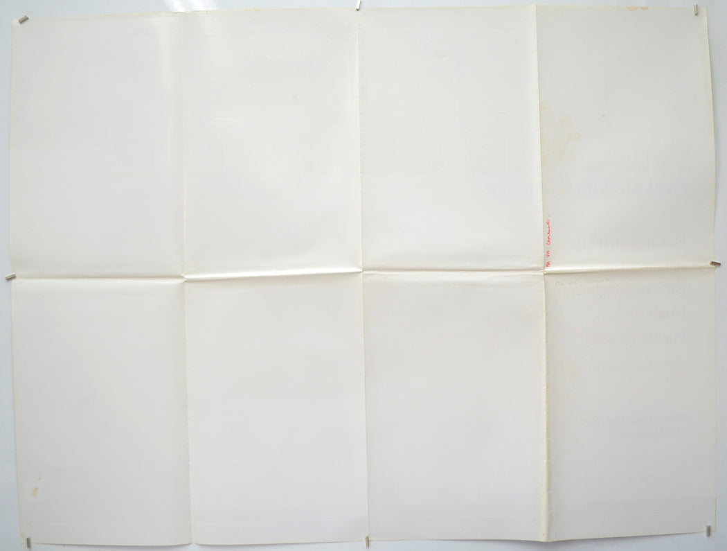 2 cm and a 1 cm thin light Brown liquid stain on the tip of the top edge (left), 1 cm tear and a couple of tiny tears also on the top edge along with a tiny crease, extremely mild edge wear on the right edge, additional horizontal fold line through the bottom border, very faint diagonal crease either side of the bottom half of both the left and right vertical fold lines, mild fold wear including additional creasing around the left vertical fold line, slight yellowing to the left vertical fold line, the title has been written on the back in red pen and there is slight discolouration/faint spots of damp on the back of the left vertical fold line and the back of the left half of the center horizontal fold (only noticeable on the front if the poster is held up to the light / backlit), otherwise good.