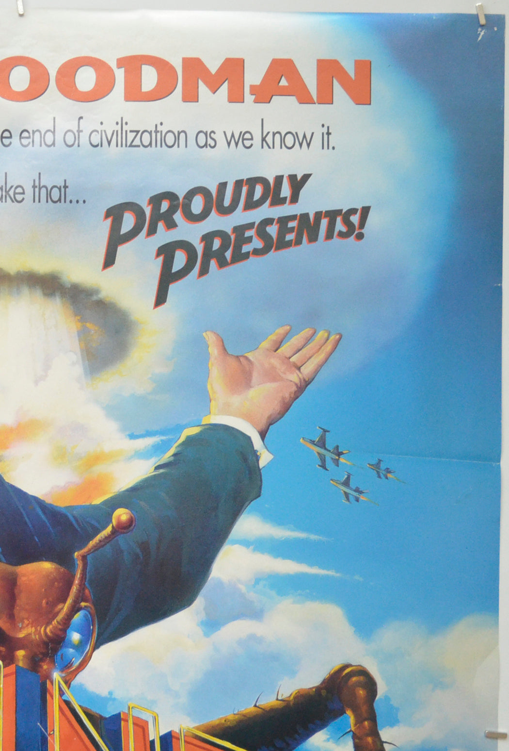 Small jagged pinhole tear near the top left corner, approximately three pinholes and a tiny spot of print loss near each of the other corners, tiny tear on the top edge, two small tears on the right edge, 12 cm horizontal crease line from the right edge across to the planes and a similar crease from the edge across to the edge of the last E of the title and two more near the bottom of the right edge into the credits block, some additional light surface creasing around the center of the right edge, extremely mild creasing and a couple of tiny spots of print loss around the bottom center, 6 cm crease across the bottom left corner, approximately 7 tiny tears and moderate creasing on the left edge, surface creasing near the left edge, the surface is lightly wrinkled throughout, numerous tiny water splashes on the left half of the poster including within Goodman’s jacket (only noticeable at certain viewing angles), tiny spot print loss on Goodman’s collar, otherwise okay.