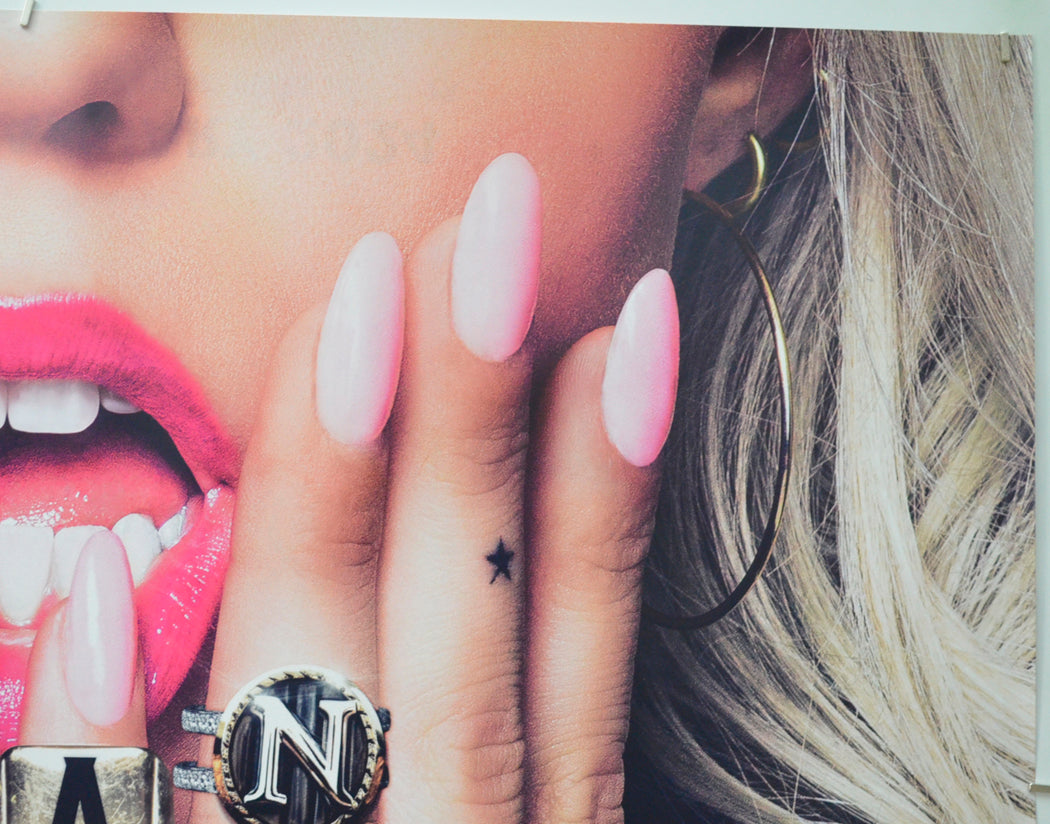 Tiny crease across the tip of the top left corner, 1 cm tear on the top edge (near left corner), a couple of extremely tiny tears and mild creasing on the bottom edge, 2 cm diagonal crease across the bottom left corner, 6 cm vertical white crease line and a couple of tiny creases near the bottom of the left edge, very faint vertical crease from top to bottom within the hair just left of the left hand, otherwise very good.