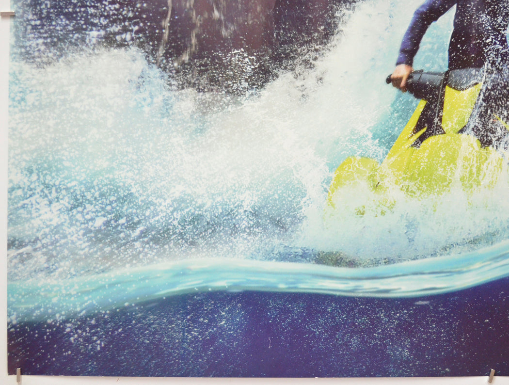 The title has been written on the back of the top left corner in blue Biro which is very lightly visible on the front (More noticeable if held to light/backlit), tiny crease across the tip of the top left corner, small tear on the right edge, 5 cm diagonal crease across the bottom right corner, 5 cm vertical white crease line from the bottom edge up to the first U in August, tiny tear and a couple of tiny creases on the bottom edge, several small white surface creases/wrinkles throughout the first 5 inches (12 cm) of the right of the poster including some white stress marks above the 2, 30 cm vertical crease down through the left of Jason Statham (there are a few small white stress marks on this crease), 20 cm horizontal crease through the front of the jet ski, 6 cm and a 5 cm vertical white crease line either side of Statham’s right arm, a few random light surface creases here and there, otherwise good.