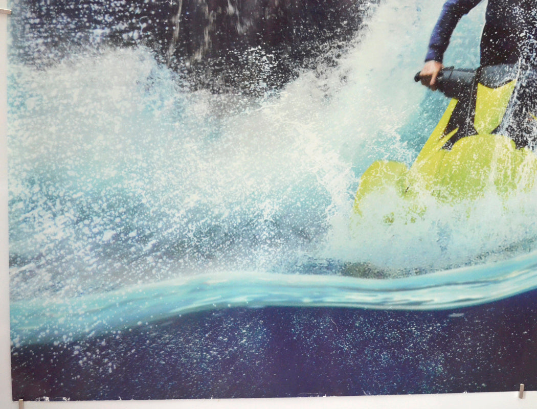 Mild creasing/edge wear on the bottom edge including approximately 5 small patches of print loss indicating the edge may have become slightly damp at some point (no apparent staining though), horizontal band of approximately ten thick 3 cm horizontal white crease lines evenly spaced across the center of the poster including one within Statham’s arm, 18 cm diagonal crease from just left of the center of the bottom edge up to the left of the jet ski, numerous light vertical roll waves from top to bottom evenly spaced across the poster along with a couple of thick more defined creases within the left of the poster, a couple of small white surface creases near the left edge, tiny white surface crease above the first S in SECONDS and another within the tooth above it, a little blu-tac grease on the back of the corners (only noticeable on the front if the poster is held up to the light / backlit), otherwise okay.