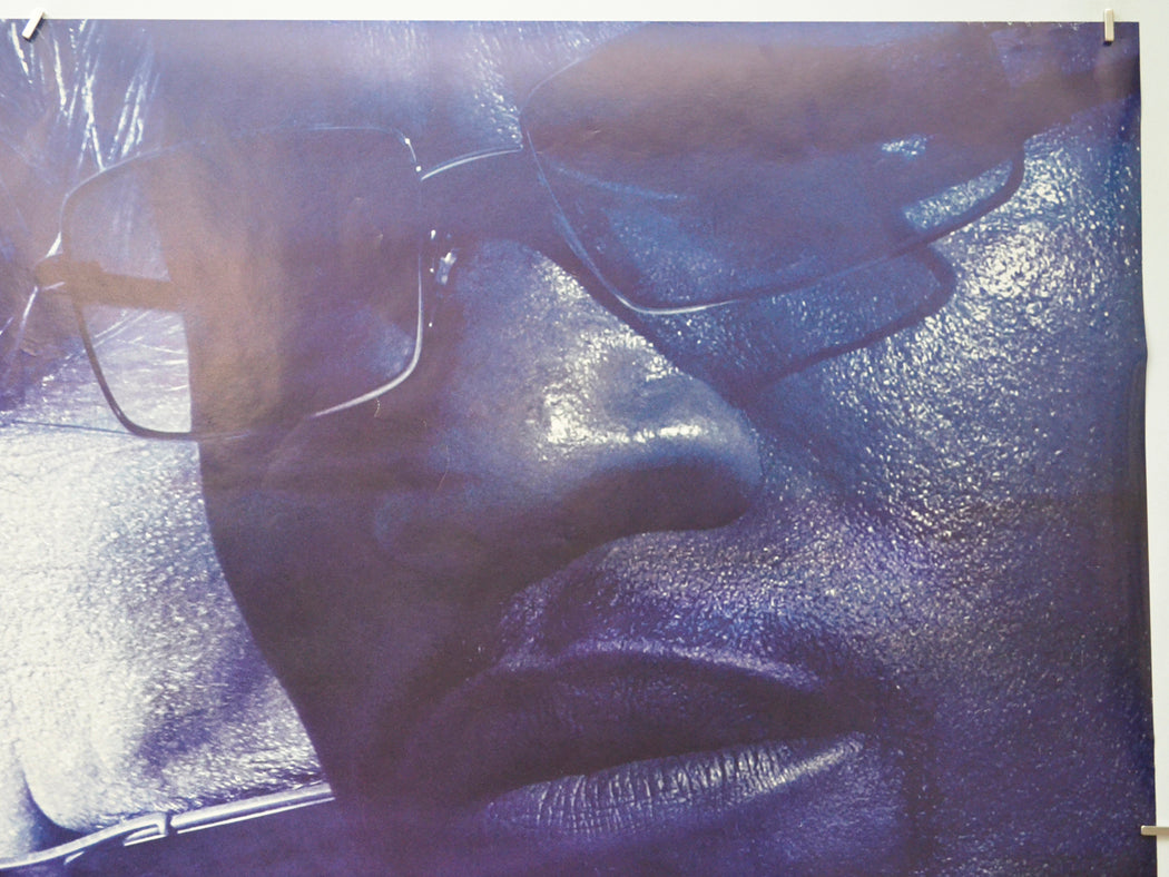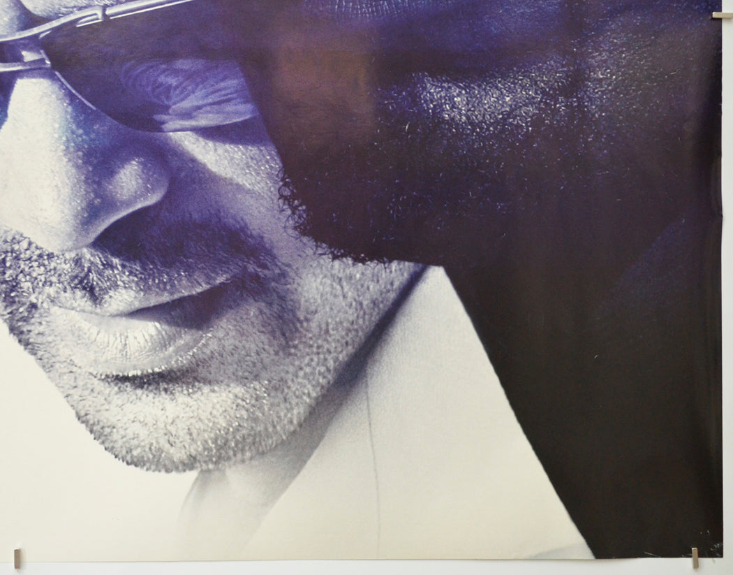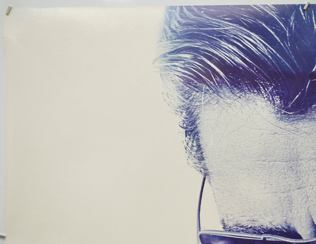 The whole poster has yellowed slightly (the white background is more of a light cream colour), 4 cm crease near the top of the left edge, 1 cm tear near the bottom of the left edge, creasing and some blu-tac grease/residue around the corners, approximately 2 tiny tears and very mild creasing on the top edge, 1 cm vertical greyish scuff line from the top edge downwards (near left corner), mild creasing on the bottom edge, a couple of tiny white surface creases near the right edge, small white surface crease just below the left lens of Foxx’s glasses and a 3 cm light crease on the tip of his nose, a couple of small dark spots just below the top edge (left of Farrell’s hair), otherwise good.