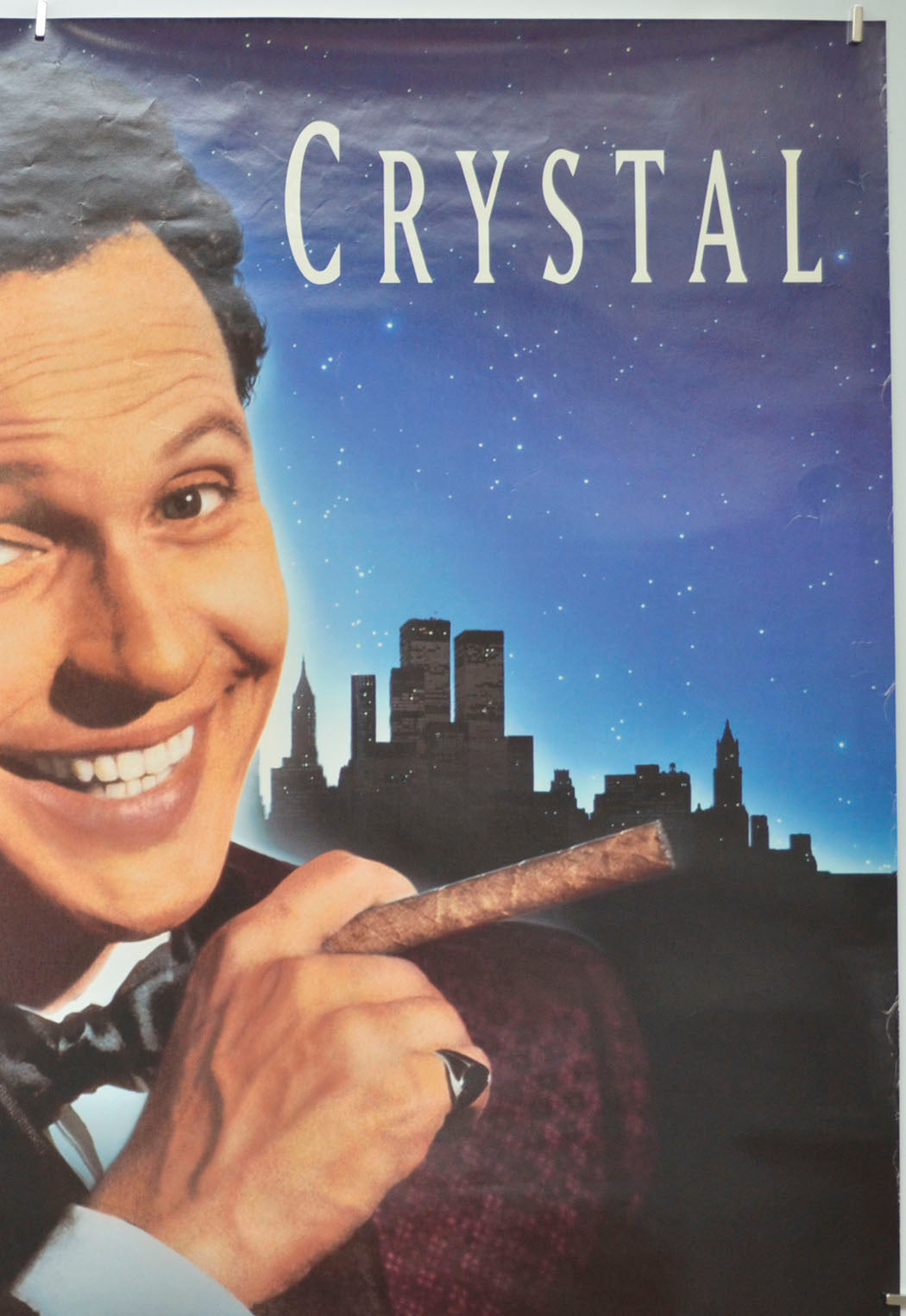 9 cm diagonal crease across the top left corner, a couple of tiny tears and moderate creasing on the right edge (heavier creasing near the bottom), 6 cm diagonal crease across the bottom left corner, two 1 cm tears along with approximately 4 tiny tears and heavy creasing on the left edge, 6 cm horizontal white crease line through the last four letters of the title and a 14 cm crease below, numerous small white surface creases around and below the title including throughout the credits block, light staining from a rubber band on the back of the bottom center area and there’s also a couple of small patches of tape adhesive staining on the back (only noticeable on the front if the poster is held up to the light / backlit), otherwise okay.