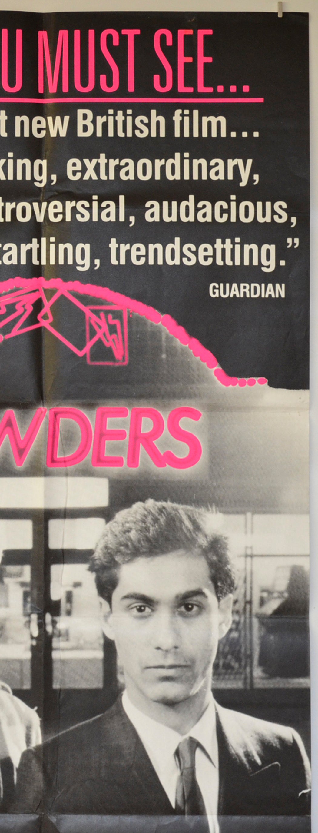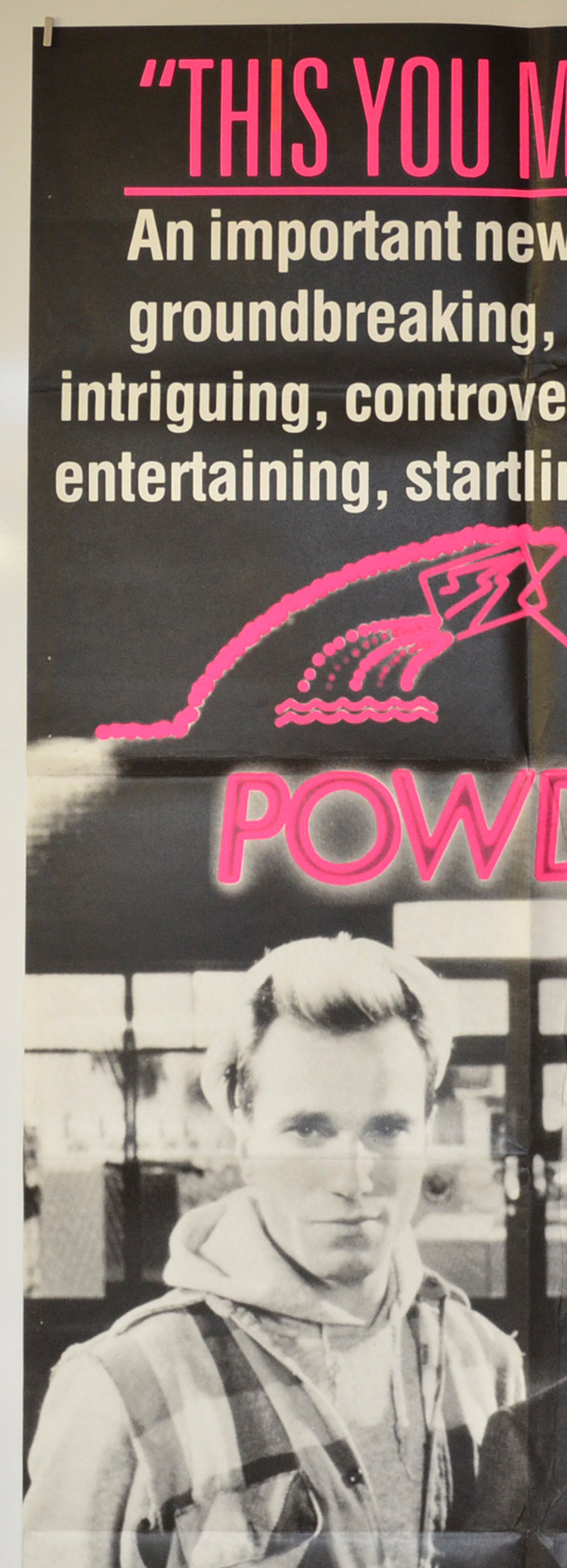 Three strip of tape adhesive staining on the bottom edge and two on the top edge, tiny white spot print loss above the second E in SEE near the top edge, two additional horizontal folds near the bottom of the poster (making a total of eight), surface crease from the fold intersection above the POWDERS text down to the fold intersection below the men’s shoulders, six pinholes near the left edge (left of the B in the title), three pinholes near the right edge (within the bottom of the L), six pinholes around the pink Laundrette text, eight pinholes near the left edge (to the left of the POWDERS text and six pinholes near the right edge (to the right of the POWDERS text), additional pinhole near the top of the side edges, title and date written on the back in Biro (only noticeable on the front if the poster is held up to the light / backlit), 1.5 cm tear on the right edge, otherwise very good.