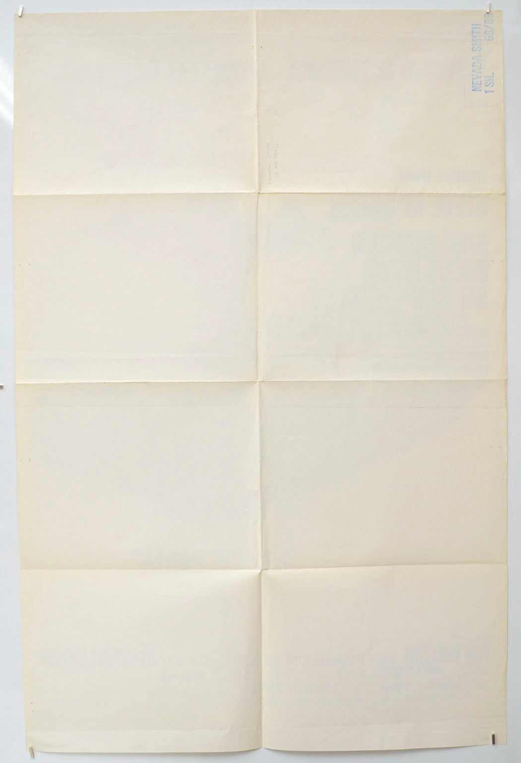 Additional horizontal fold near both the top and bottom edges, the whole poster has browned very slightly with age, 1 cm tear along with two tiny tears on the top edge, 1 cm tear and extremely mild creasing on the bottom edge, tiny slither torn from just below the top of the left edge, tiny tear and very slight Browning to the tip of the left edge, slightly diagonal crease from just above the bottom of the left edge across to the right edge (crossing the bottom fold line), a couple of light grubby marks around the bottom center, four light Brown patches (fingermarks?) In the white background below the bottom right of the artwork, a few light fingermarks around both side edges (a little heavier near the top right corner), 2 to 4 pinholes near every corner and the center of the top and bottom edges, two pinholes either side of the center of both the side edges (four above the center of the right edge), 5 x 2 cm faint liquid streak in the white background above the head of the woman on the left, tiny grey dot above the Vallone credit, light surface creasing around the top center, very mild fold wear including a tiny wear hole at the top and center fold intersections, standard blue title ink stamp on the back of the top left corner (only noticeable on the front if the poster is held up to the light / backlit), extremely light horizontal crease from left to right just above and below the center horizontal fold line, otherwise very good!