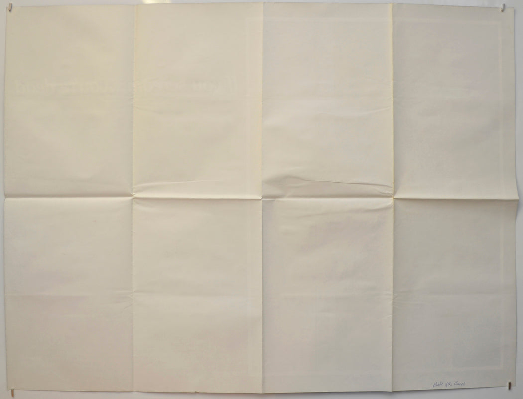 Three tiny tears and very mild creasing on the bottom edge, mild creasing on the right edge, extremely mild creasing on the top edge, extremely mild fold wear (note there are three horizontal fold lines), numerous tiny light speckles within the black background below the title and a few within and above it (print error?), Left edge have been cut very slightly out of alignment it just cuts into the “advertising viewing committee” circle at the bottom left corner (this is exactly the same on another copy I had so may be the entire run was cut like this), otherwise very good!