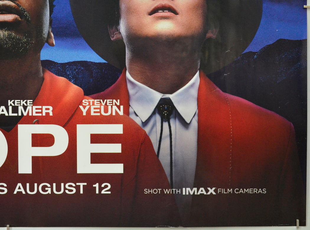 Two tiny tears and extremely mild creasing on the bottom edge, 1 cm white surface crease within Yeun’s right jacket collar and three creases just above it including within the bottom of the hat, a couple of additional small white surface creases within the right of the hat and one near the top left of it, several tiny white surface creases near the right edge (mostly just right of the hat), 2 cm diagonal white surface crease also near the right edge (just above the clouds near the top), vertical crease from just below the top edge down to just above Palmers left shoulder (there are several white stress marks across this crease and around it), 1 cm horizontal thick white surface crease just left of Palmers ear, some light vertical roll creases throughout, small blu-tac grease mark above the top left of the Yeun’s hat and another below the WRITER/DIRECTOR text (has a tiny speck of print loss to the left of it), some light surface rippling within Yeun’s shirt area and along the bottom edge indicating these areas may have become slightly damp at some point (no apparent staining though), otherwise good.