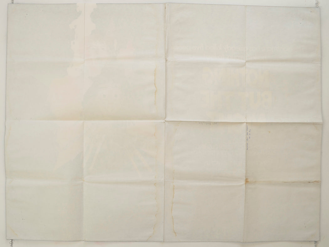 10 cm wide light Brown liquid stain completely down the back of the center of the poster and a 1-5 cm very light Brown liquid stain down the back of both side edges of the poster (the staining is not visible on the front unless the poster is held to light/backlit but it has lightly creased/wrinkled the surface), extremely mild edge wear on the right and bottom edges, two extremely tiny tears at the center of the right edge, 2 cm tear across the center vertical fold line (a couple of inches below the top) and this has been taped up from the back, 3 to 5 pinholes near every corner (some have torn slightly and some are a few inches inward of the edges), three pinholes near the center of both side edges, pinhole near the center of the top and bottom edges, pinhole near the bottom of both the left and right vertical fold lines (a few inches up from the bottom), extremely mild fold wear (note there are three horizontal fold lines), title written on the back in Biro and there is a small Brown patch of damp on the back of the bottom fold intersection of the left vertical fold line (all only noticeable on the front if the poster is held up to the light / backlit), otherwise very good… In my opinion it would look excellent if backed and framed.
