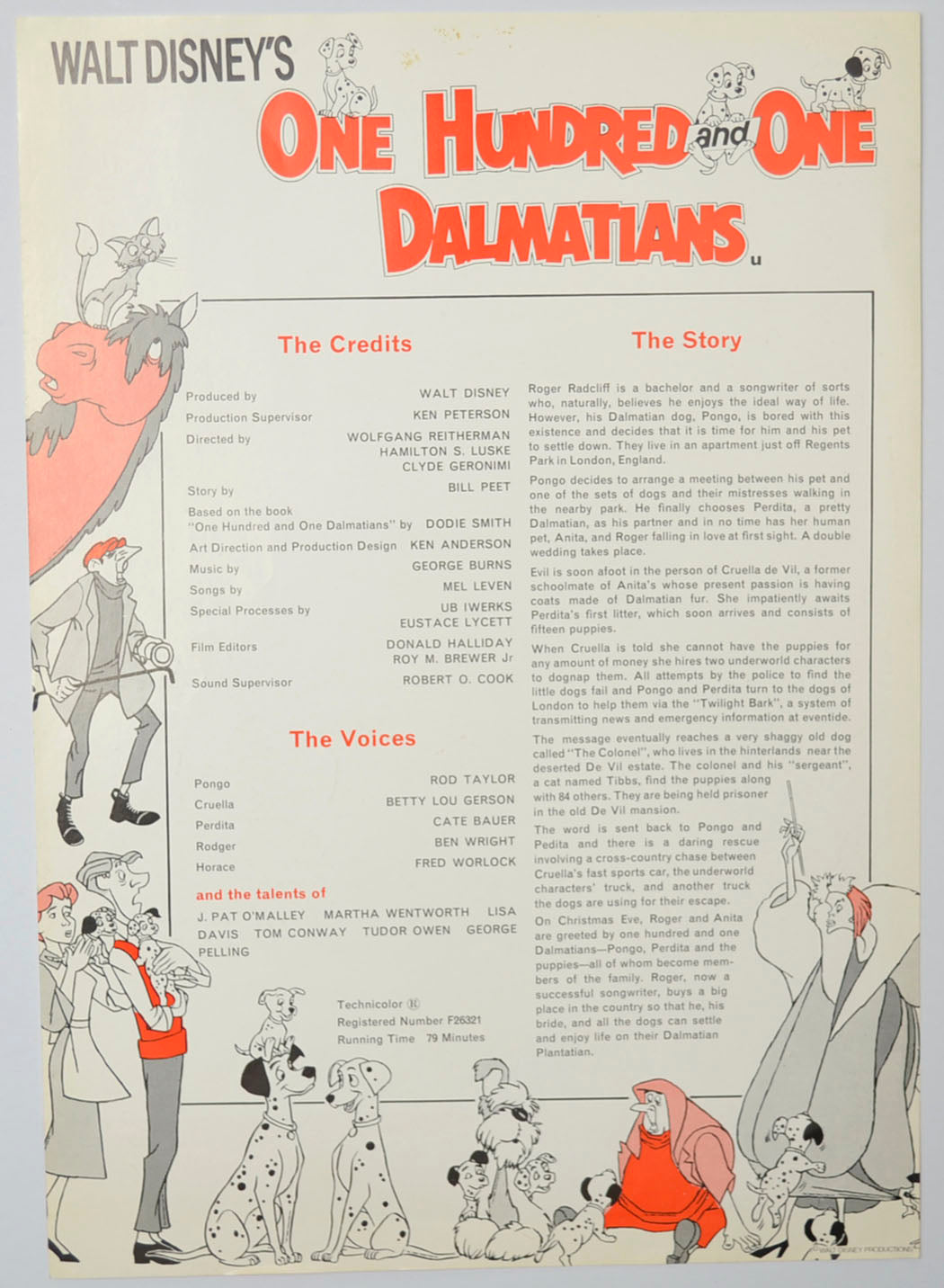 “One Hundred and One Dalmatians” (a.k.a. 101 Dalmatians) Original Cinema Exhibitors Synopsis / Credits Sheet (UK)