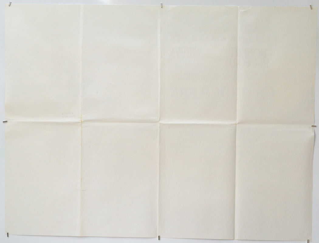 Two 6 cm diagonal creases across the top of the left vertical fold line, 6 cm diagonal surface crease either side of the top of the right vertical fold line and a smaller crease either side of the top of the center vertical fold line, 1 cm tear and a tiny tear on the top edge along with very mild creasing, extremely mild creasing on the bottom edge, tiny crease across the tip of the bottom left corner, extremely mild creasing/edge wear on the left edge (mostly central), several small light surface creases near the center of the left edge, additional vertical fold line just left of the main center fold and some additional creasing around the other fold lines (due to being folded out of alignment and refolded), 5 cm tear across the right vertical fold line (through Redford’s knee), mild fold wear (stress marks on some the fold lines and creasing around the intersections), tiny Brown spot of damp (foxing) just below the top edge (left), a few tiny Brown spots of damp (foxing) on the back of the bottom half of the right vertical fold line (only noticeable on the front if the poster is held up to the light / backlit), otherwise very good.Double Sided :