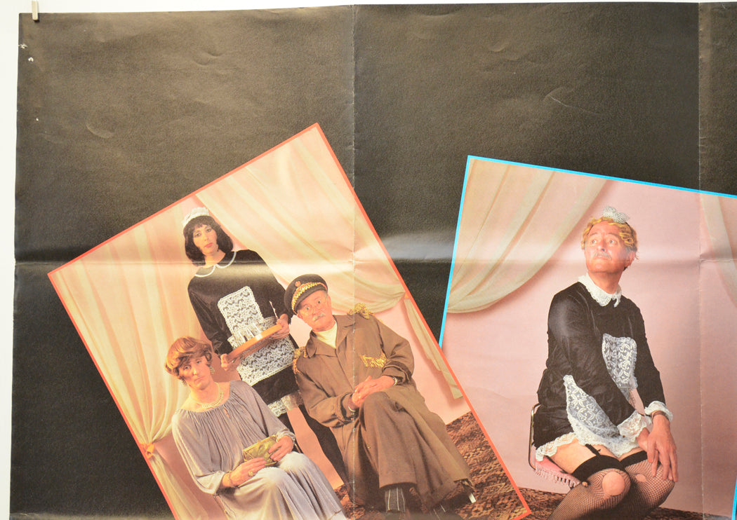A couple of tiny tears and moderate edge wear/creasing on the right edge, extremely mild edge wear and a small tear on the left edge, three pinholes near the top of the left edge and two near the top of the right edge, approximately 9 pinholes in the black background to the left of the Julie Walters picture, two pinholes below the knees of the man in tights, pinhole above the right arm of the man with the silk scarf, pinhole to the right of the title, fold wear (stress marks on all fold lines) note there are three horizontal and three vertical folds as issued, light horizontal crease in the black background between the Julie Walters picture and the picture with the blue border, title and date written on the back in Biro along with a little blu-tac grease (only noticeable on the front if the poster is held up to the light / backlit), otherwise good.