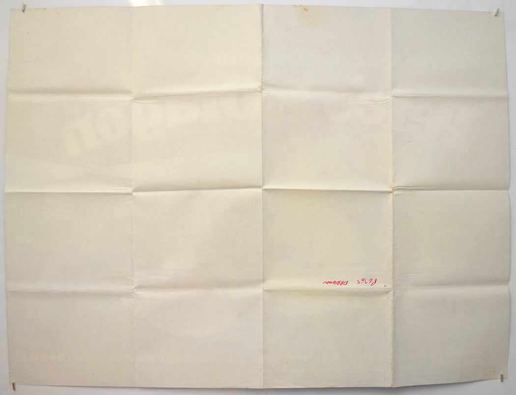 The title has been written on the back of the poster in red felt pen (this has bled through to the front within the bottom of the Dragon’s belly going just below the boy’s outstretched arm), 7 x 5 cm faint light Brown liquid stain on the back of the top of the poster with some darker brown spots of damp within the center of it (a couple of the dark spots are lightly visible on the front the rest is only noticeable if held to light/backlit), small patch of dark Brown spots of damp on the back of the bottom left corner (these are lightly visible on the front… More so if the poster is held to light/backlit), light Brown spots of damp on the back of the bottom half of the left vertical fold line and some on the back of the left half of the bottom horizontal fold line (only noticeable on the front if the poster is held up to the light / backlit), two pinholes near the top left corner and one near each of the other corners, pinhole near the top center, two pinholes near the bottom center, pinhole at the bottom of the Dragon’s belly, two pinholes in the woman’s dress, pinhole a few inches above the bottom center, extremely mild fold wear (creasing around the fold intersections) note there are three horizontal and three vertical folds, otherwise very good.