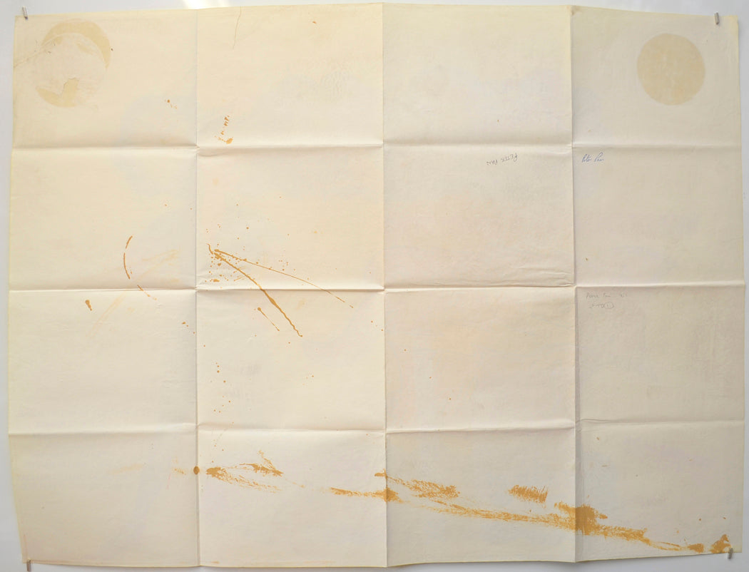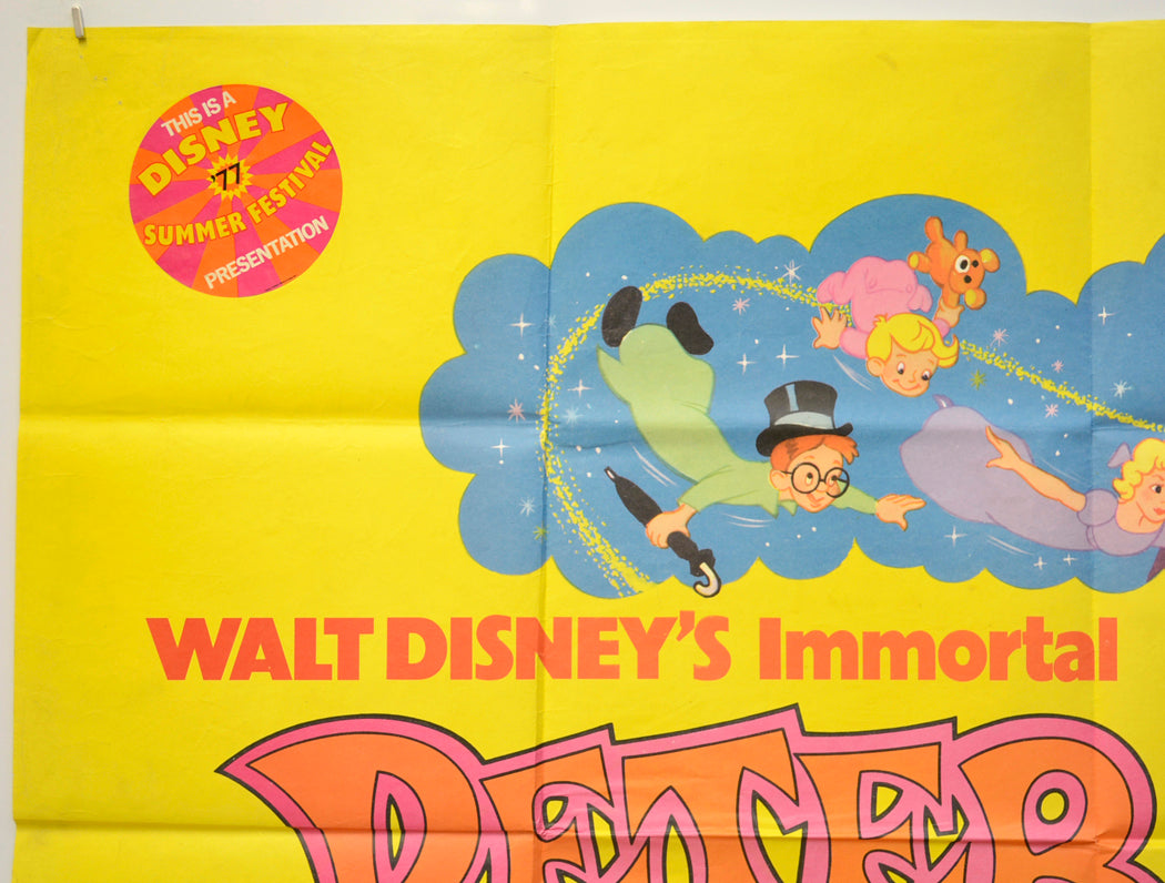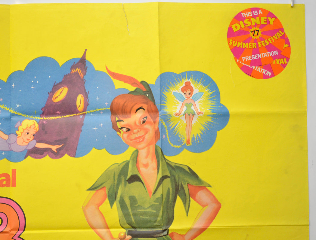 POOR! - Three large DISNEY ‘77 SUMMER FESTIVAL circular stickers stuck near the top corners (there is a 3 x 2 cm area of poster paper loss on the back of one of the ones on the right), 6 cm tear coming down from the left of the stickers on the right, 6 cm tear from the top edge downwards (right of center), numerous small grey liquid splashes throughout the bottom four right corner fold sections (mostly to the right of Peter Pan’s legs and within the credits), several grubby fingermarks around the corners and side edges, small pink print mark below the first letter of the title, four pinholes near the top left corner, three pinholes near the top right corner, numerous streaks and splashes of Brown paint on the back of the poster (mostly across the bottom and on the left) these are lightly visible on the front especially the streaks coming through Peter Pan’s left arm.(The rest are more noticeable if the poster is held to light/backlit), the surface is fairly creased throughout the left of the poster and also around the right edge, additional grubby marks or fingerprints here and there, title written on the back twice in Biro (only noticeable on the front if the poster is held up to the light / backlit), creasing around some of the fold intersections (note there are three horizontal and three vertical folds), otherwise okay.