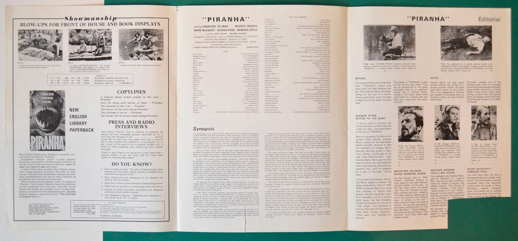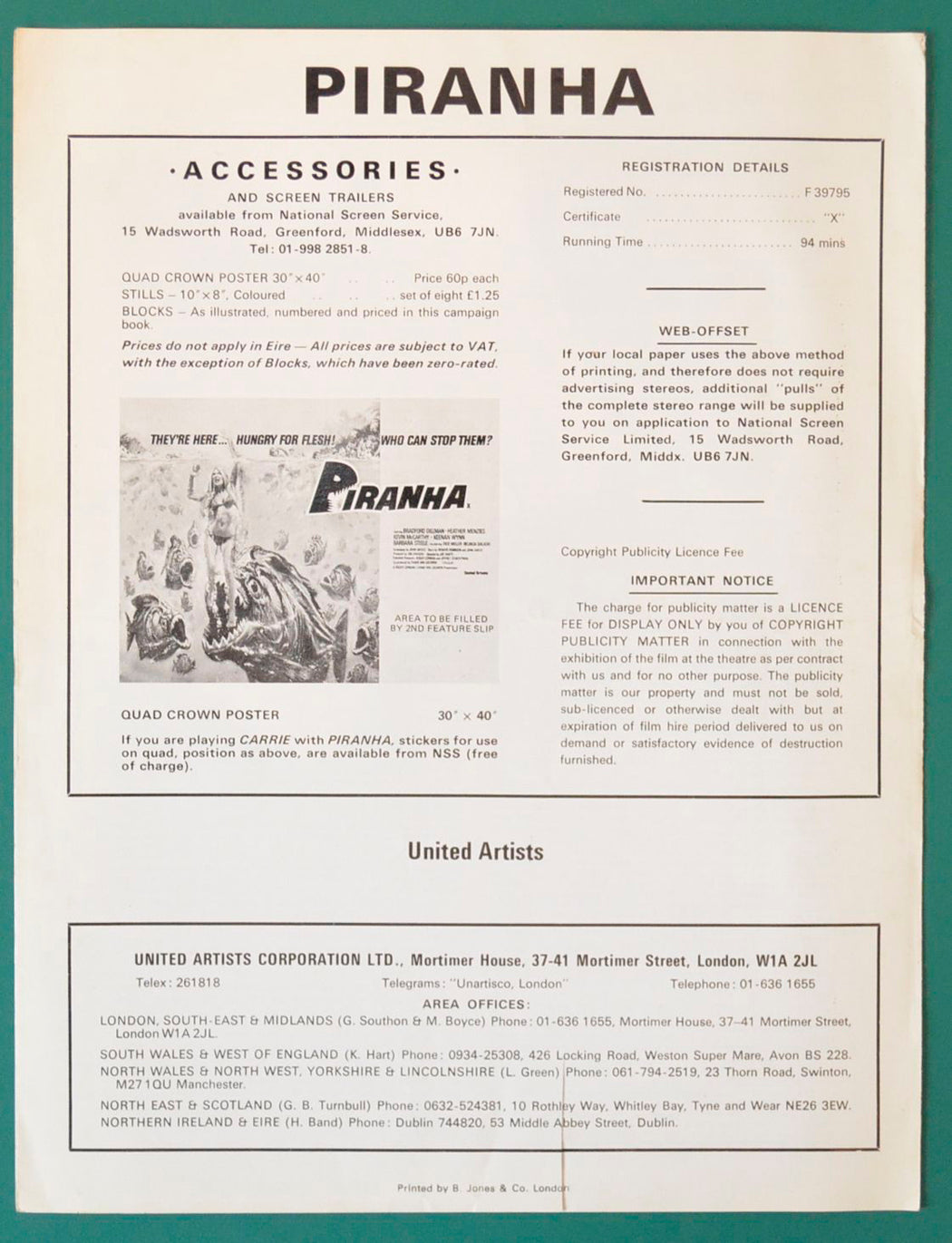 “Piranha” Original 6 Page Cinema Exhibitors Campaign Press Book + Synopsis / Credits Leaflet
