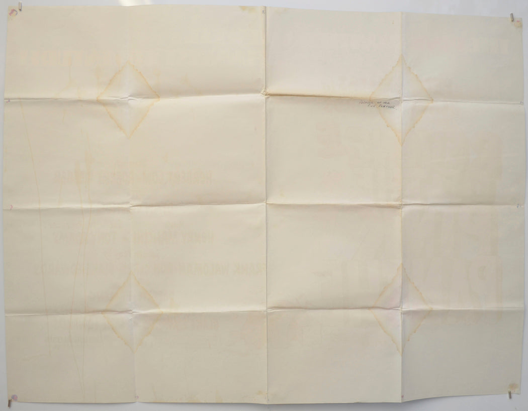 Four 16 x 12 cm diamond shaped light Brown water stains on the back of the poster (these are visible on the front around the top and bottom fold intersections on both the left and right vertical fold lines), approximately five thin water stain streaks from top to bottom on the back of the left of the poster (these are only noticeable on front if held to light/backlit), blu-tac grease/residue on the back of every corner and the center of every edge (lightly visible on the front… More so if the poster is held to light/backlit), very mild fold wear including a tiny wear hole at the top fold intersection on the center vertical fold line (note there are three horizontal and three vertical folds), otherwise good.