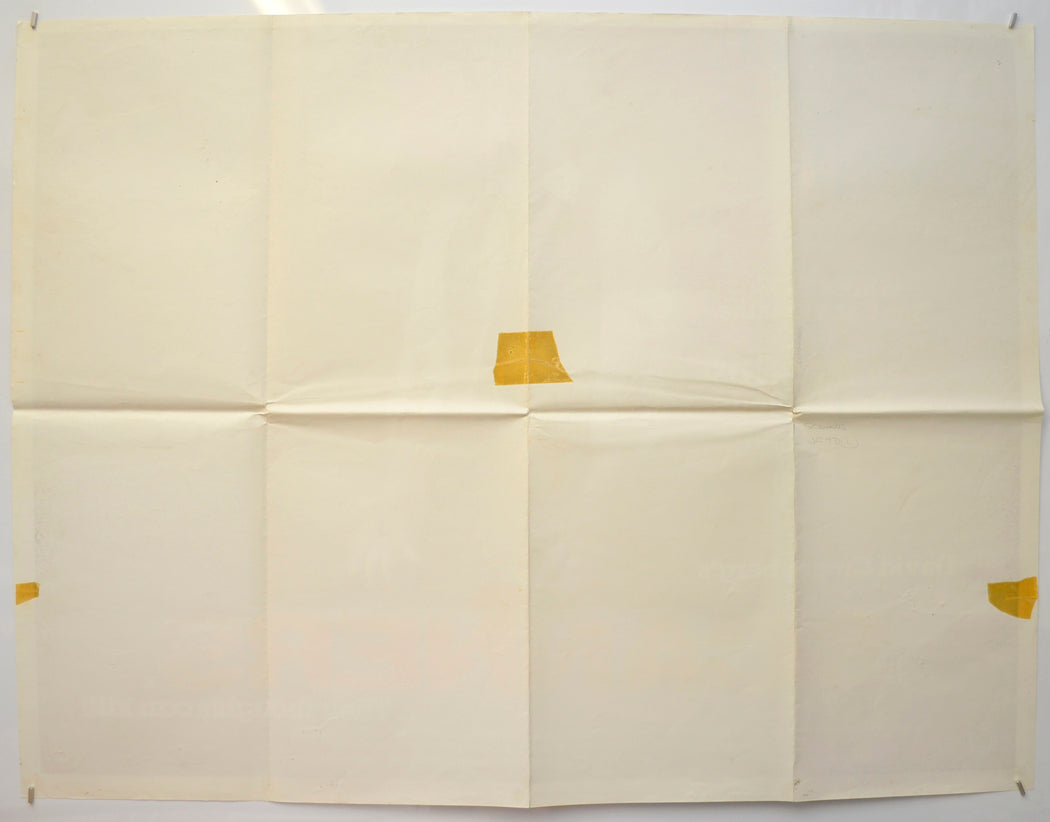4 cm tear near the bottom of the left edge with surrounding 5 x 4 cm Brown tape adhesive stain (the tape is on the back and the adhesive has stained through), 3 cm tear near the bottom of the right edge with a 3 x 2 cm tape adhesive stain surrounding it (again the tape is on the back), three small tears also on the left edge, tiny tear and a four tiny blackish stain spots also on the right edge (bottom half), small tear at the center of the bottom edge, tiny tear and very mild creasing on the top edge, twelve staple holes in the top left corner section (eight within the main image), eighteen staple holes within the top right quarter of the poster (most are within the black background and most are several inches inward of the edges), twelve staple holes near the bottom right corner (most are just within the black background of the main image), fourteen staple holes within the bottom left quarter of the poster (most are just left of the first letter of the title), eight staple holes just left of the bottom of the right vertical fold line, 9 cm tear through the left of the waistcoat (this has a 8 x 5 cm strip of tape on the back of it and the adhesive has stained through to the front… Blends well with the waistcoat both is much more noticeable if held to light/backlit), 3 cm white crease patch to the left of the 10 SECONDS text, several small white surface creases within the black background near the right edge and a couple near the other edges, mild fold wear including a tiny wear hole at the left and right fold intersections plus white stress marks on all fold lines, otherwise good.