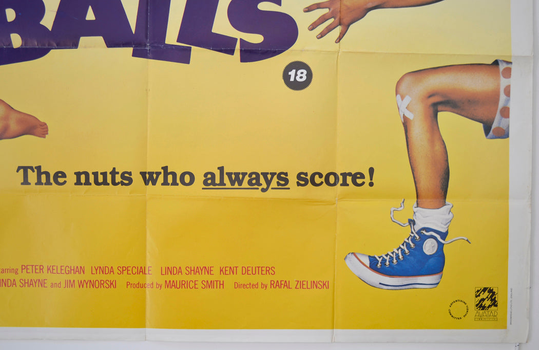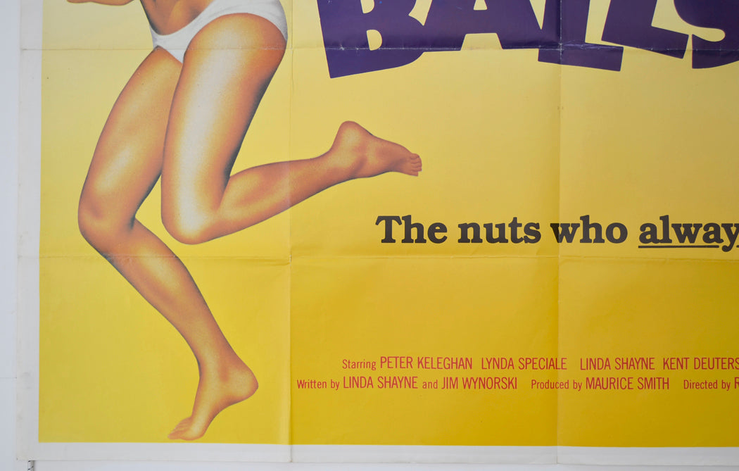 1 cm tear and a smaller tear on the left edge along with mild creasing, extremely mild creasing on the bottom edge, six small tears and mild creasing on the right edge, a number has been written on the back of the top left corner in black pen which is lightly visible on the front… More so if the poster is held to light/backlit, fold wear including a tiny wear hole at couple of the fold intersections plus white stress marks on all fold lines (Note there are three horizontal fold lines), small grey patch near the top of both the left and right vertical fold lines (damp spots?), Slight yellowing to the top of the vertical fold lines, light surface creasing near both side edges, two fine blue print error streaks through the edge of the “A” in “BALLS” and another above the “S”, tiny Brown spot of damp in the white background above the top fold intersection on the right vertical fold line, a few faint Brown patches of damp on the back of the top left area along with a small Biro scribble (only noticeable on the front if the poster is held up to the light / backlit), some light grubby marks around the corners, otherwise good.