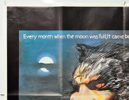 Tiny crease across the tip of the top right corner, light 2 cm diagonal crease across the bottom right corner, extremely mild creasing on the top and bottom edges/borders, tiny light Brown spot of damp (foxing) at the top of the right vertical fold line, two tiny indentations in the left border (above fingernail,), creasing around some of the fold intersections including a crease from just above the right intersection across to the werewolf ear, light 5 cm diagonal crease in the black background just right of the top center, light 2 cm diagonal crease in the black background below the werewolf thumb, light 6 cm horizontal crease just above the werewolf hand, two tiny grubby marks on the back of the tip of the right edge (below center and only noticeable on the front if the poster is held to light/backlit), otherwise excellent! Probably never displayed.Double Sided :