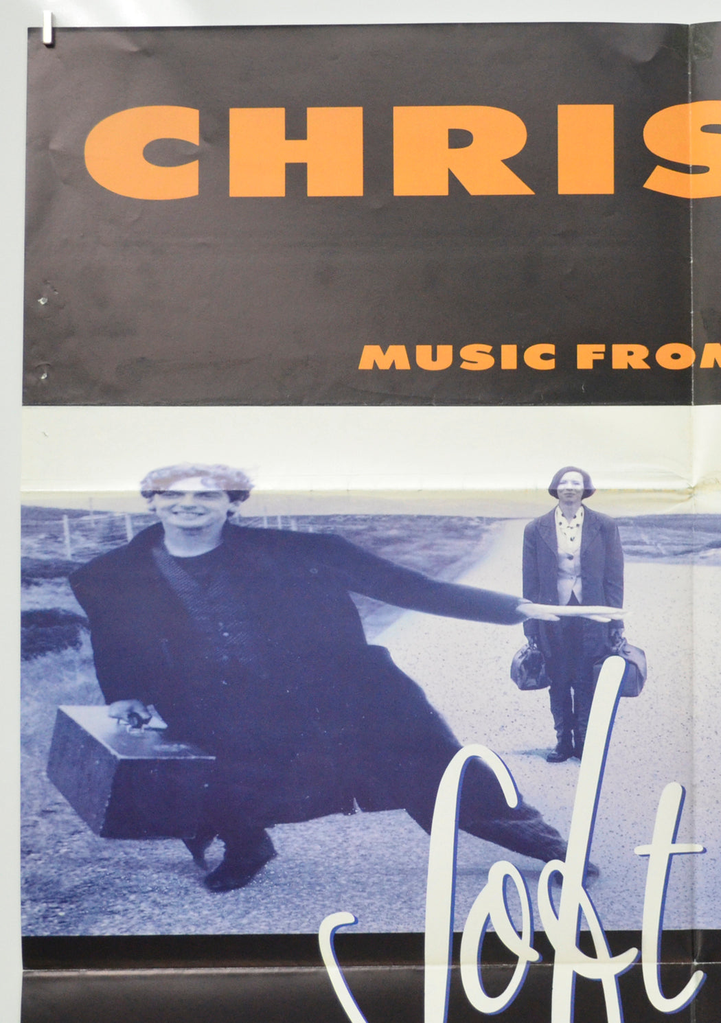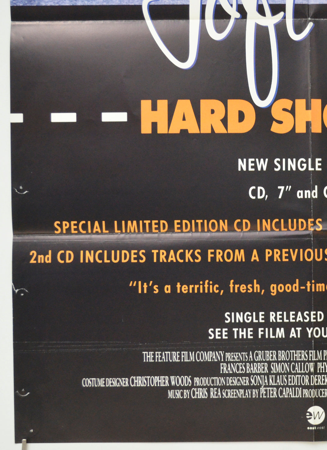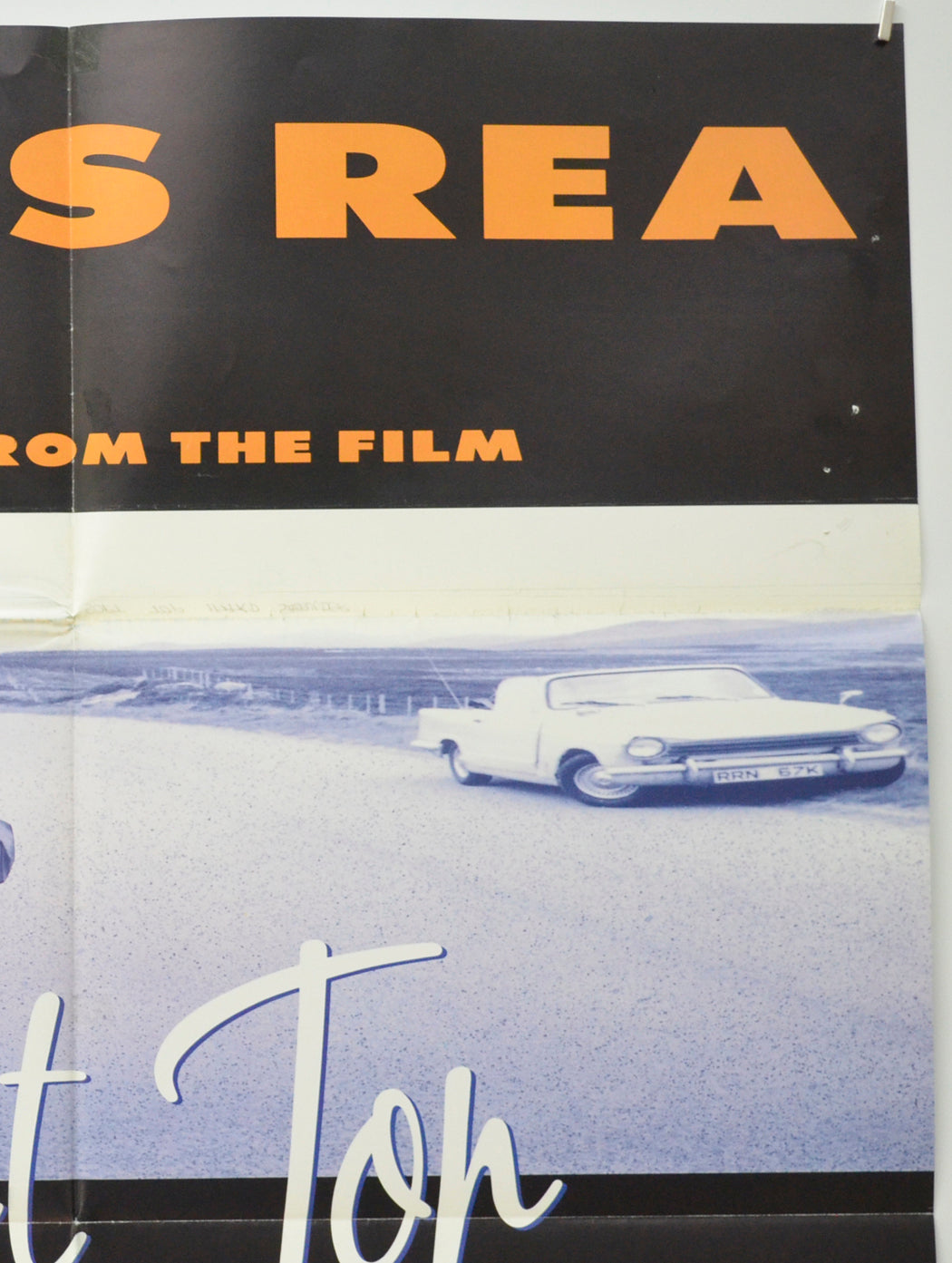 Pinhole near both bottom corners, three pinholes near the bottom half of the left edge (all three have semicircular surface tears around them and one has torn through to the edge), three pinholes near the top of the left edge, four pinholes near the top of the right edge and four within the bottom half of the right edge, small patch of tape adhesive staining at the top center, additional horizontal fold line around both the top and bottom main horizontal folds, two additional horizontal fold lines just above the credits block at the bottom, additional horizontal fold just below the MUSIC FROM THE FILM text at the top, some light fingermarks around the edges and corners, some blue print has transferred onto and around the top horizontal fold line (throughout the white sky area), the title has been written on the back in Biro and the pressure from the pen has embossed the surface on the front and a little blueish print has transferred onto this (in the white sky area just right of the center vertical fold line), additional light fingermarks below the CHRIS REA text, two pieces of Sellotape on the back of both the left and right edges and another piece on the back of the center of the poster (for no apparent reason) these are only noticeable on the front of the poster is held to light/backlit, mild fold wear (white stress marks on the fold lines), otherwise okay.