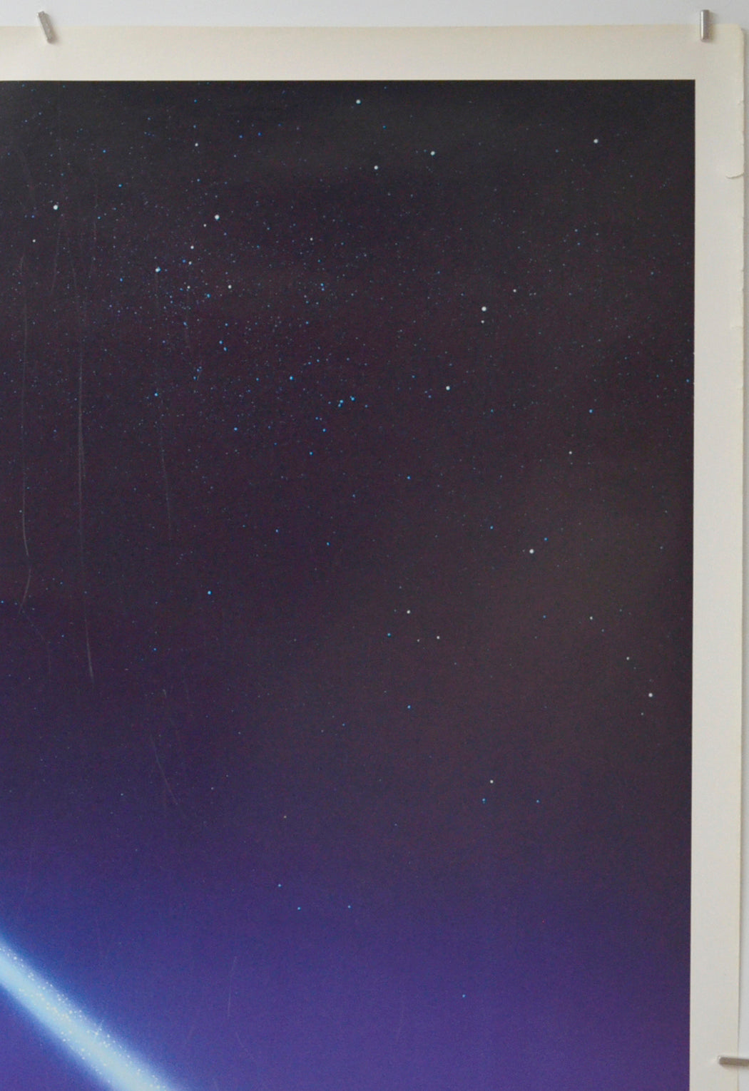 Numerous faint Brown spots of damp (foxing) within the bottom white border (mostly near the right corner), a few extra tiny spots of damp on the tip of the top edge and at the bottom of the side edges, extremely tiny piece torn from the tip of the top right corner, tiny crease across the top left corner, 1.5 cm tear along with approximately 17 smaller tears at the top of the right edge, a couple of extremely tiny tears and extremely mild creasing at the bottom of the right edge, two tiny tears near the top of the left edge, numerous fine scuff lines completely down through the central vertical third of the poster, tiny spot of blu-tac grease/popcorn grease? on the back of the bottom center of the poster (not noticeable on the front), otherwise very good.