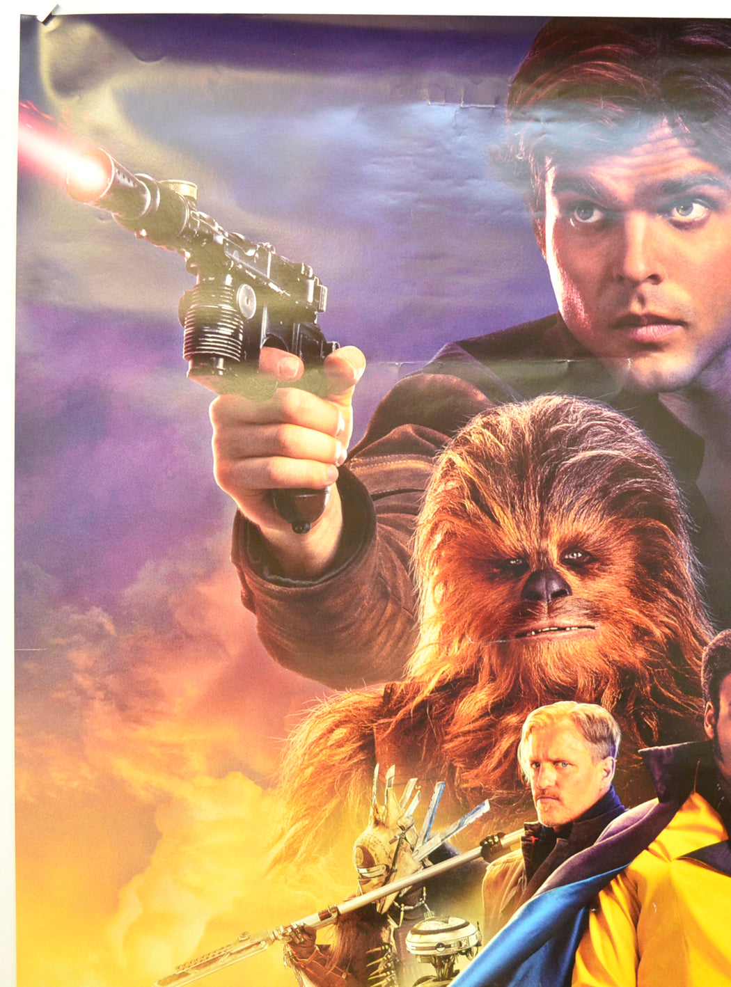 Six horizontal crease lines (all spanning from left to right edges) evenly spaced down the poster (all have stress marks at various points along them ..but mostly within the center left areas.. The most noticeable is from Solo’s chin across to his trigger finger), a couple of additional small white surface creases within Solo’s hair, otherwise okay.