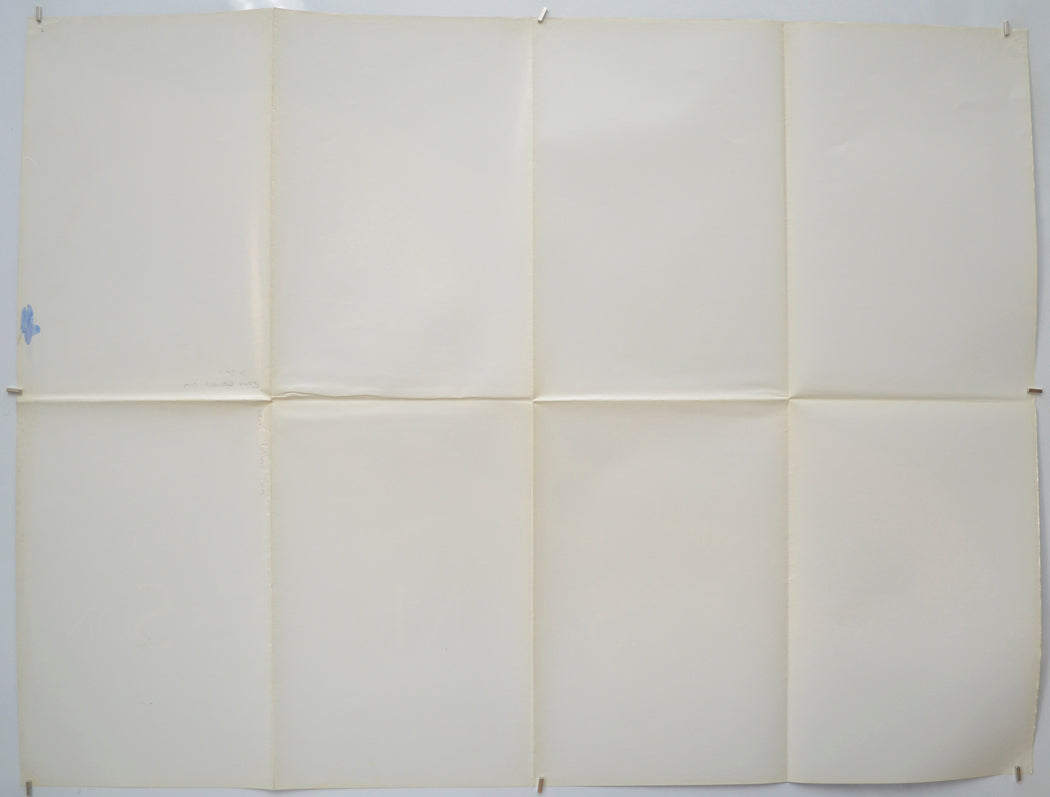 Creasing around every corner including several white stress marks (heavier near the top corners), very mild edge wear on the left edge, two pinholes near every corner, mild fold wear (white stress marks on the fold lines), 4 x 2 cm patch of blue ink? on the back of the right edge and the title has been written on the back in Biro (only noticeable on the front if the poster is held up to the light / backlit), the back of the fold lines have yellowed slightly (not noticeable on front), otherwise good.